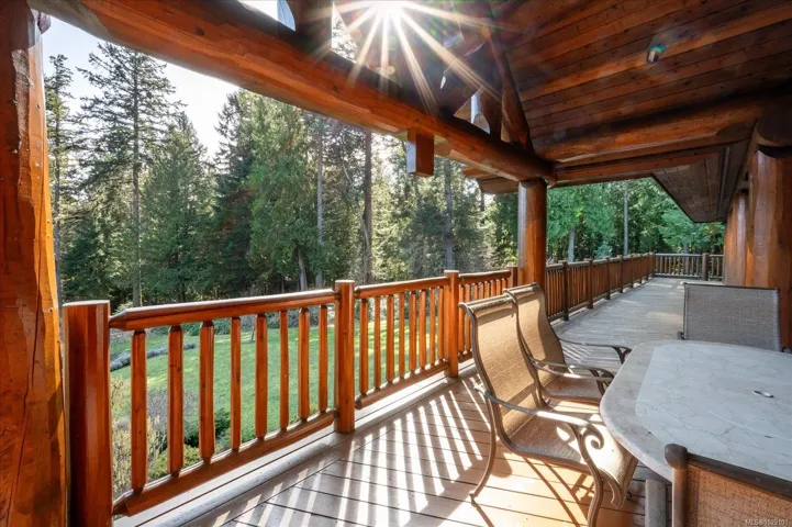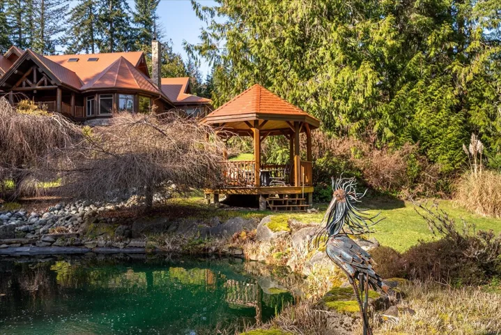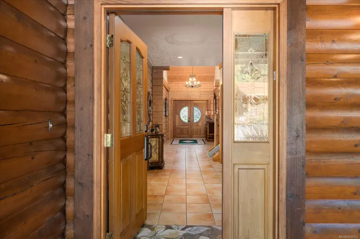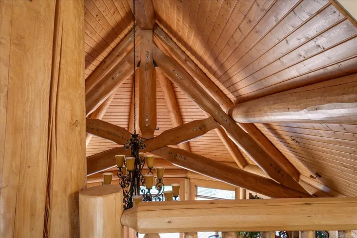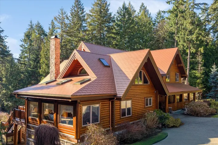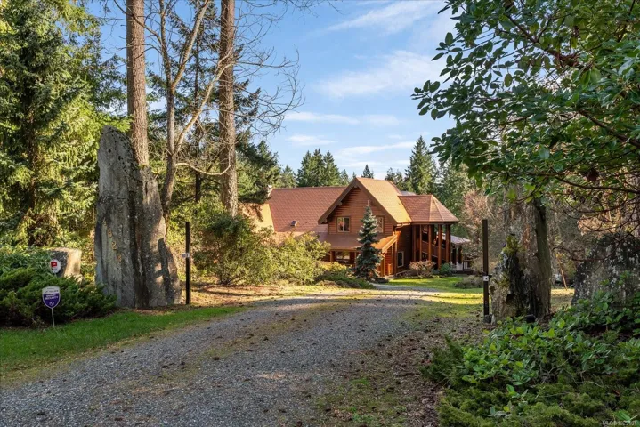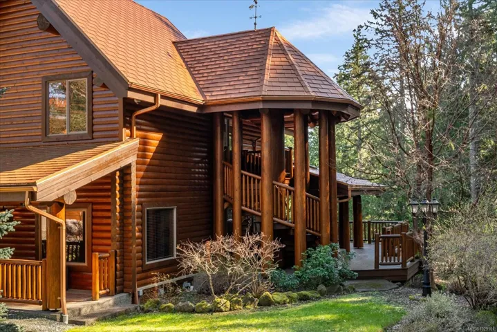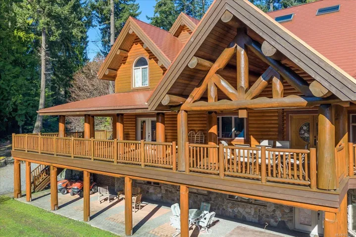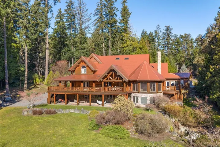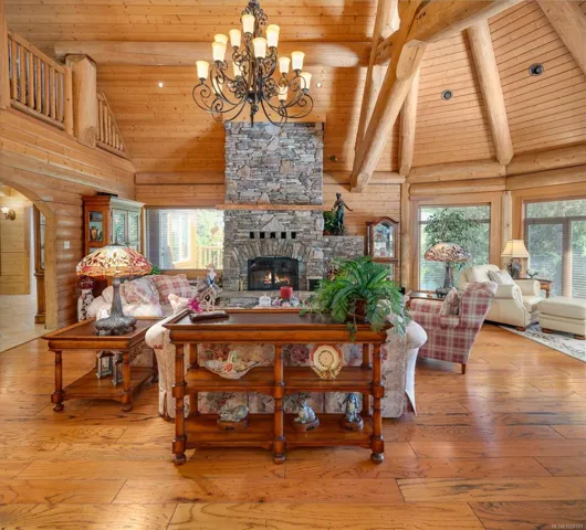 Quiet country living awaits with this impressive 8,200 Sq. Ft. custom Engelmann Spruce Log Home! Sited on 15 private acres in coveted Yellow Point, just 15 minutes to Nanaimo or Ladysmith. Exceptionally finished throughout, the residence features a breathtaking great room with grand kitchen and dining area plus a sunroom and a grand living room with a dramatic 22’ vaulted ceiling anchored by a grand stone fireplace. Perfectly designed for entertaining spaces! Bright, south-facing large decks and patio areas frame a picturesque pond and outdoor areas. The generous footprint includes 3 bedrooms (Could be more) all with their own ensuite including an incredible primary bedroom. Approx. 3 acres are cleared for gardens and recreation with a gazebo plus an RV site. With quiet country elegance, meticulous finishes, abundant storage and versatile rooms, this property blends stunning log home design with with contemporary style for year-round entertaining, quiet retreats, and future expansion.