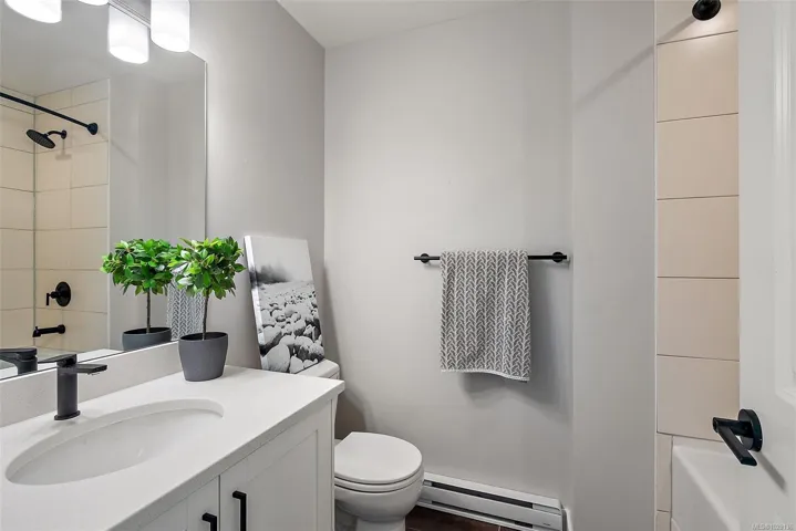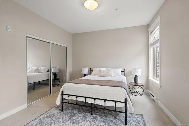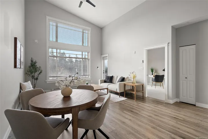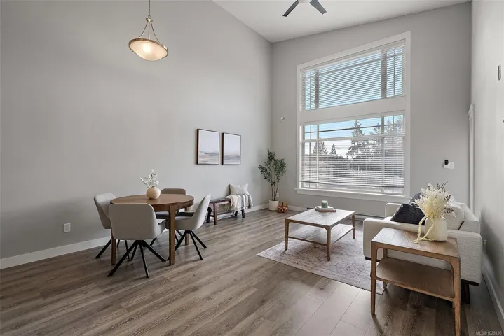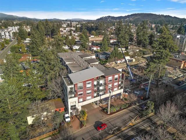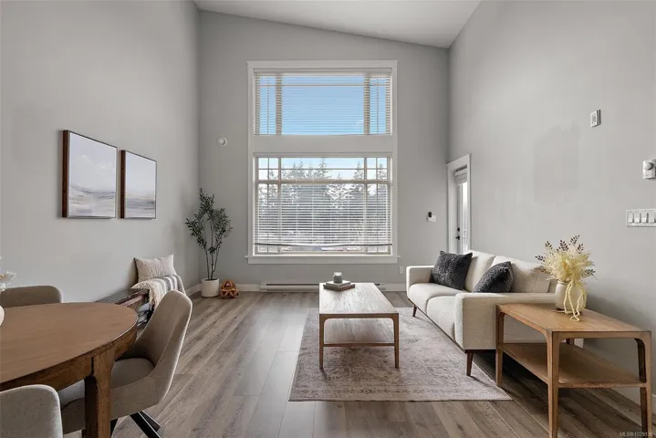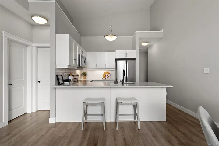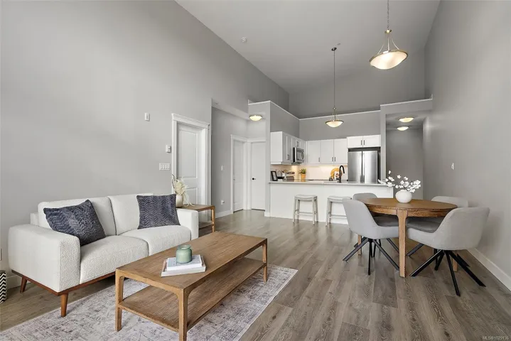 Top-floor, fully updated and one of the largest units in the building, this 2-bedroom, 2-bathroom condo at 844 Goldstream Avenue is located in the heart of Langford and showcases impressive 17-foot vaulted ceilings with a bright, open-concept living, dining, and kitchen layout. Large windows flood the home with natural light, creating an airy and welcoming atmosphere. The spacious kitchen offers quartz countertops, newer appliances, and an eat-in island—ideal for everyday living and entertaining. This unit includes a secure, covered parking stall. Enjoy exceptional walkability to shopping, restaurants, transit, and the new university campus. A fantastic opportunity for first-time buyers, professionals, or investors seeking space, location, and low-maintenance living. Move-in ready and available today! BELOW ASSESSED VALUE