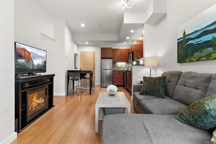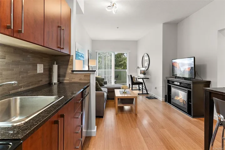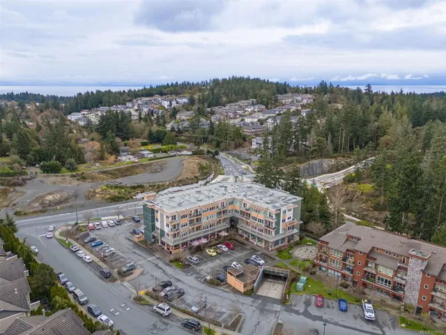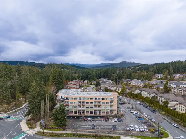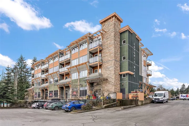 Come take a stroll through Latoria Walk, an eye-catching building on the western edge of Colwood. This top-floor unit has southwestern exposure off its covered patio. So, even with Veterans Parkway on your doorstep, the quiet patio faces a wild stretch of the Westshore. Olympic View Golf Course is the immediate neighbour, with Witty’s Lagoon and the Sooke Hills beyond. Other features include nine-foot ceilings; a sleek, four-piece bathroom; in-suite laundry; electric fireplace; bamboo floors; and stylish finishings throughout. The well-managed strata provides secure, underground parking as well as a storage locker on the same floor. Latoria Walk’s lower level houses a convenient pharmacy and Red Barn Market grocery store (known for its range of tasty, in-house offerings). This location puts you just twenty minutes from events in downtown Victoria or from adventures in East Sooke Park. Closer to home, you can enjoy Esquimalt Lagoon, Thetis Lake, and endless amenities of the Westshore.