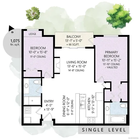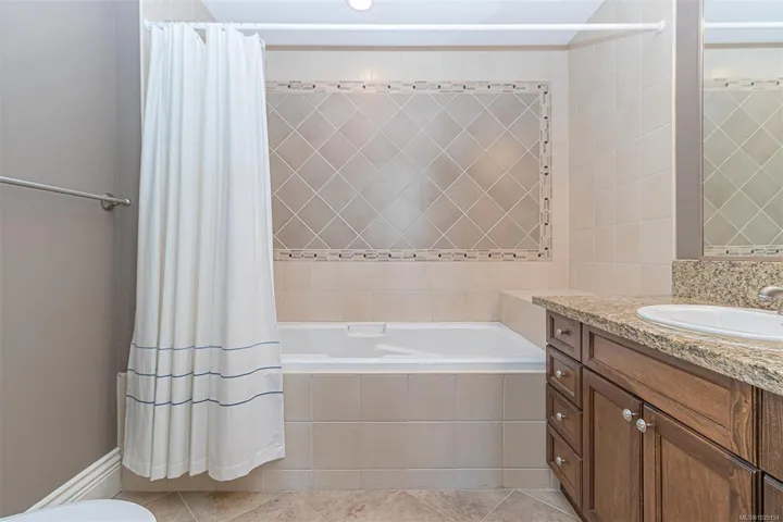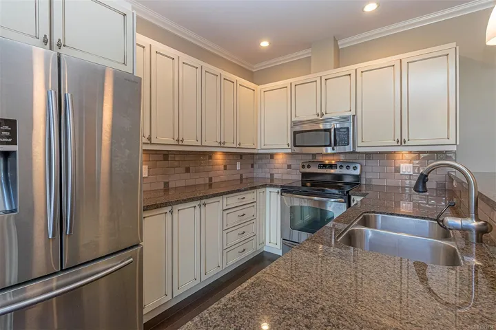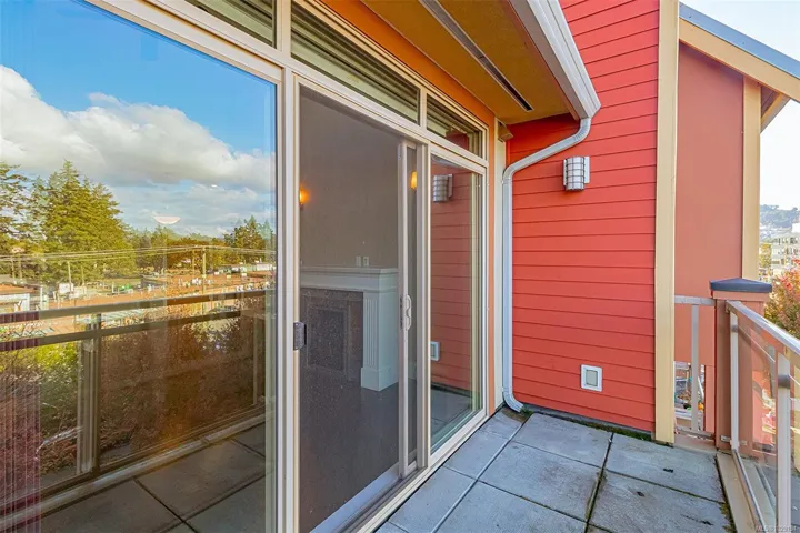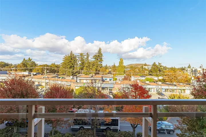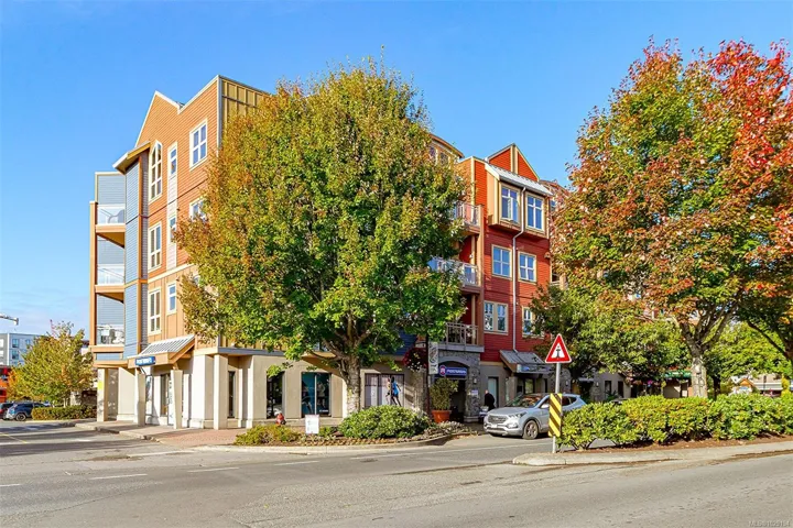 Premiere Location! ~ Welcome to the Metro, 2 Bed & 2-Full Bath Penthouse in vibrant Goldstream Village… Walkable to stores, schools, restaurants, coffee shops, library, John Horgan Campus, RRU university & more! This fabulous home has gorgeous VAULTED CEILINGS with over 1,030 sqft of bright open concept living! Enjoy wood & tile floors throughout, a chefs kitchen complete w/both a sit up bar & dining space. The barrel vaulted living room has a cozy fireplace & access out to the deck which has spectacular views over to Mill Hill & Bear Mountain. The primary bedroom presents 2 double closets plus a stunning tiled 4-piece ensuite w/ 6-ft soaker tub. The 2nd bedroom boasts a window bench & ample closet. Main 3-piece bath with a large shower. Hot water is included in the monthly strata fee. Complete with a walk in laundry room, spacious underground secure parking stall & large storage locker directly behind it.