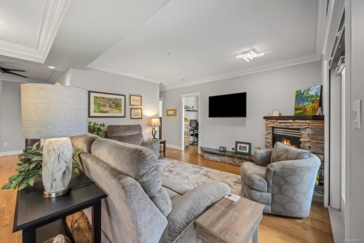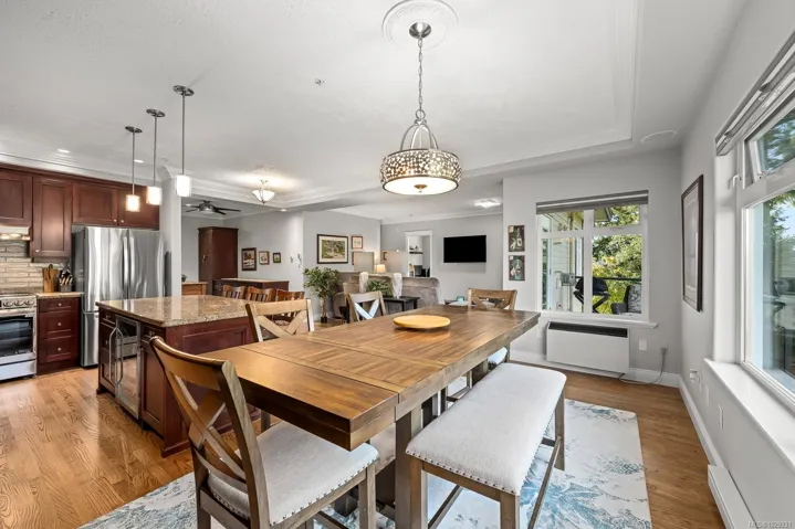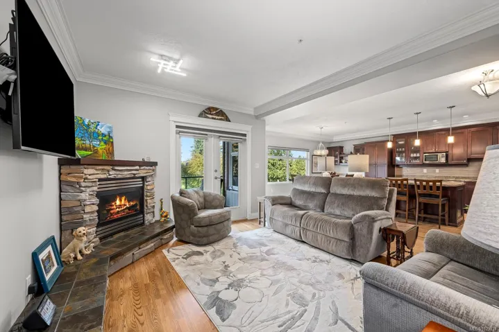 Hardwood floors throughout (bedrooms carpet), and custom gas fireplace in the living room. The bathrooms have heated tile floors, custom closets, and both bedrooms are spacious with double aspect windows and filled with sunlight. There is natural gas hookup for barbeque and kitchen stove.