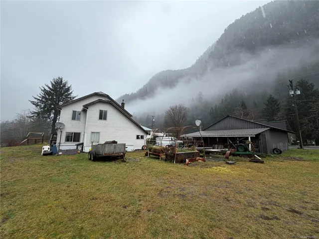3 bedroom plus den, 2 bathroom 2 level home with beautiful custom woodwork throughout, including trim, crown moulding and attractive yellow cedar entertainment centre included. Upstairs offers original hardwood, 3 bedrooms, family room and full bathroom. The laundry beside the family room leads to the back deck entrance. The main level enters through enclosed boot room and is ready for new flooring of your choice. The living room has access to the back yard and is open to the dining area connected to the kitchen. Custom West Coast Alder cabinets with an abundance of counter space and nifty built ins. The bathroom on the main level is currently a 2 piece and is ready for a tub/shower of your choice. Den is next to bathroom. Some updates within the last 6 years include a heat pump, new rails on back deck, new metal roof on the home, and bathtub & surround upstairs. Outdoors offer 1/4 acre, 26×33 garage (60 amp panel but not wired) with covered storage and woodshed attached. Garden beds.