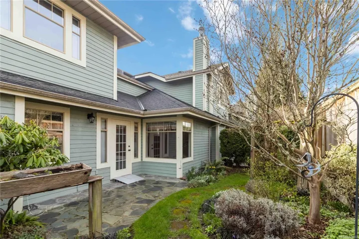 French doors open to a private garden with a flagstone patio, irrigated perennial borders, and mature trees—a rare find in townhouse living.