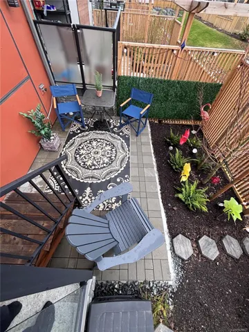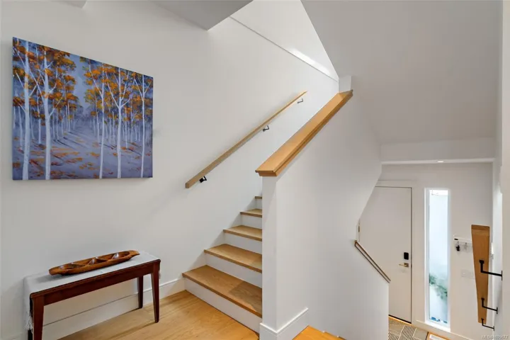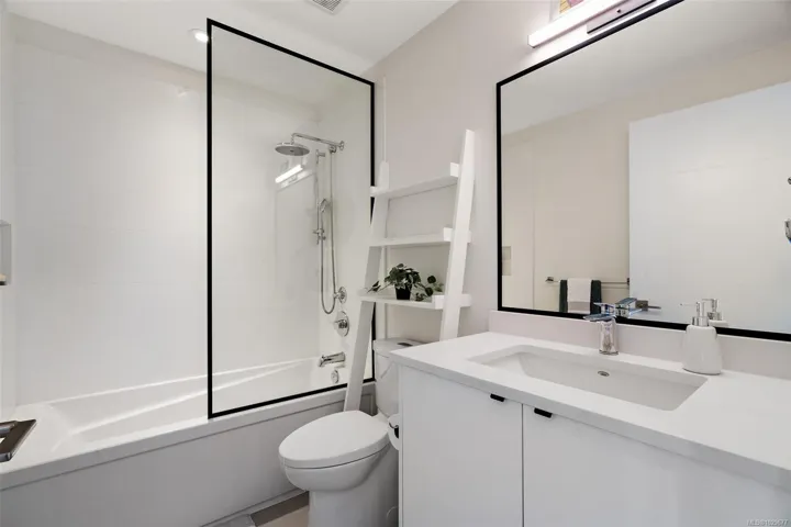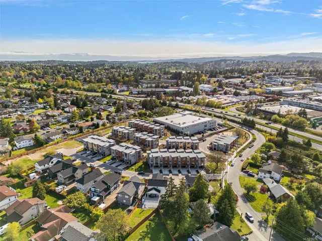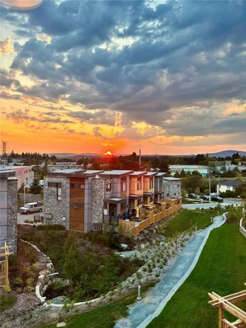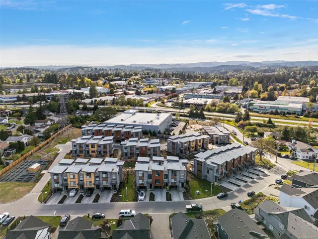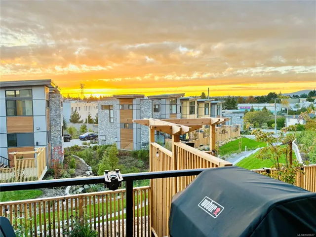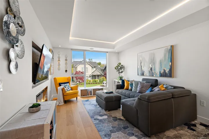 Almost new, no GST! Luxury 3+ bed, 4 bath townhome with 2,000+ sqft in a quiet, central location. West Coast design with soaring rooflines, stone & wood accents, and transom windows. Main level boasts high ceilings, natural light, open-concept living/dining, and a gourmet kitchen with quartz counters and premium stainless steel appliances. Covered back porch with gas BBQ leads to a fenced patio and yard backing onto community green space. Upstairs: 3 spacious bedrooms including primary with walk-through closets and spa-like ensuite, plus full bath and laundry. Lower level: media/bonus room with 4th bath—ideal for guest suite, gym, or theatre. Features: radiant heated tile, engineered hardwood, electric blinds, hot water on demand, HVAC, electric fireplace, single garage, EV & central vac ready. Family-friendly community with community gardens, playground, and shared green space, minutes from schools, shopping, and Rithet’s Bog trails. Balance of new home warranty remaining.