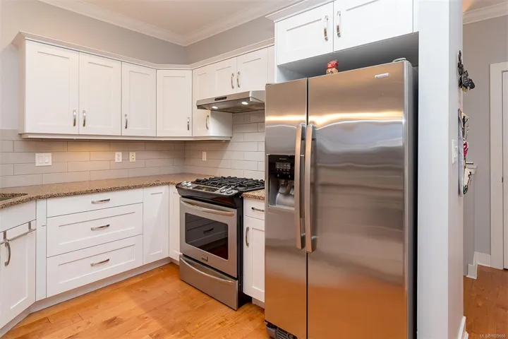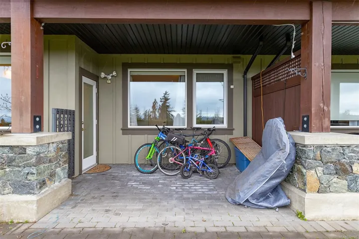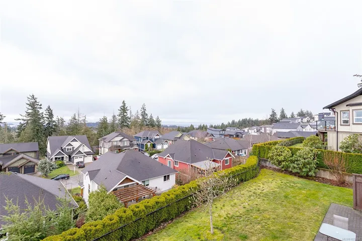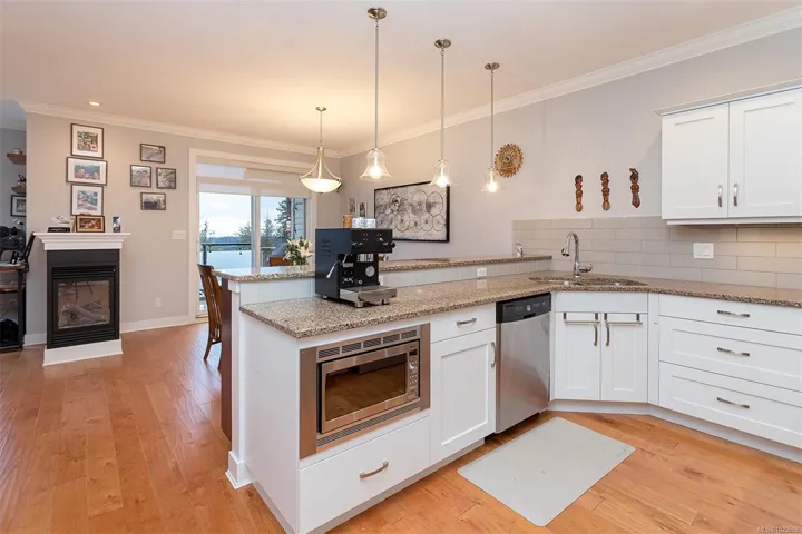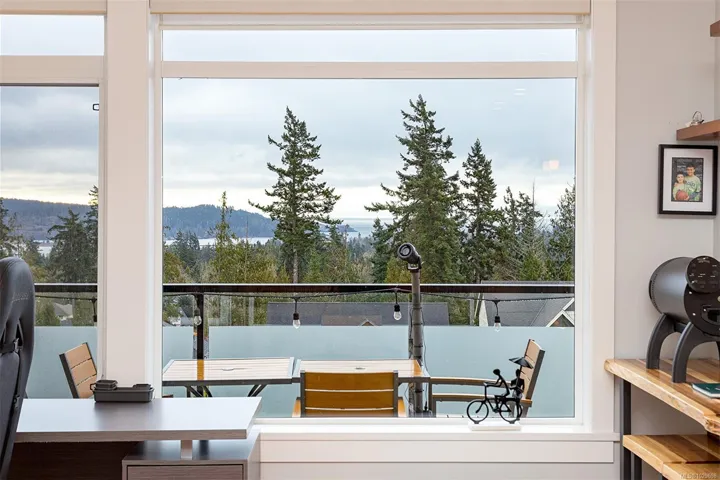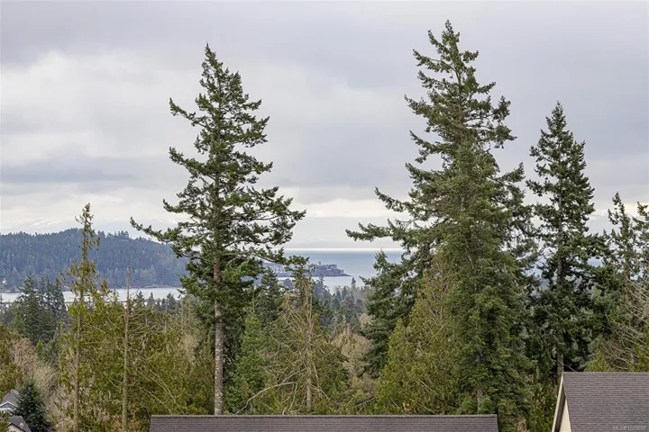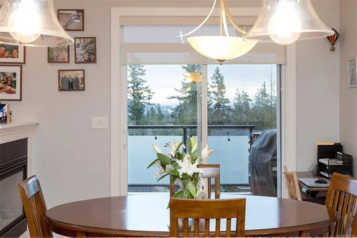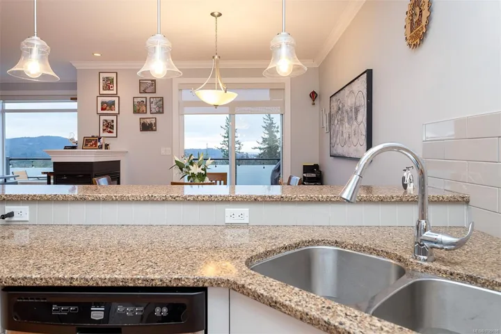 Stunning 3 bedroom townhome in one of the nicest complexes in Sooke, ‘The Rise’ at Stone Ridge Estates in Sooke. Enjoy breathtaking ocean and mountain views with unforgettable moon settings and sunrises from almost every room. This bright, south-facing home offers an open floor plan filled with natural light. The well-appointed kitchen features quartz countertops, ample cabinetry, and a generous pantry. Living and dining areas are warmed by a 3-sided peninsula gas fireplace, with glass doors leading to a sun-drenched deck overlooking beautifully landscaped grounds and sweeping views. Engineered hardwood floors on the main and new laminate below. One main-level bedroom is ideal for a den or office, with the primary and third bedroom on the lower level. The primary offers a full ensuite with heated floors, double vanity. And through the glass door to a private patio and little rose garden. Full laundry room, garage, storage, ample parking in a well-run strata. Energy efficient and quiet.