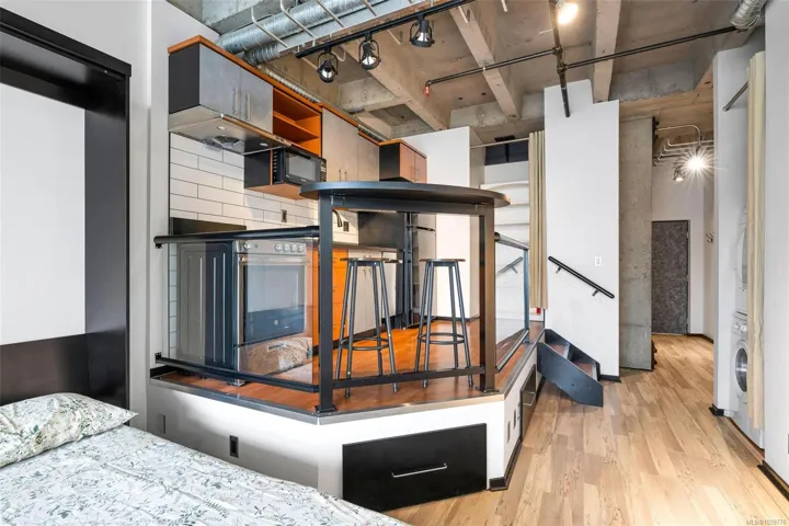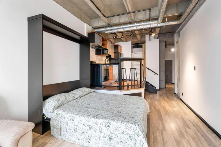 Welcome to the Mosaic, where you’ll find this studio condo that makes smart use of space in a location that speaks for itself. The raised kitchen creates a natural separation from the main living area, giving the home a more functional feel. The open living space flows easily to a private balcony, with floor-to-ceiling windows bringing in plenty of natural light. Enjoy the addition of a new Murphy bed, making it easy to transition the space from day to night. In-suite laundry and a gas fireplace add to the level of comfort that’s often hard to find in a studio, while a separate storage locker and dedicated bike storage provide added convenience. Dog owner? No problem. This building is pet friendly and allows up to two dogs (see bylaws). Surrounded by cafés, restaurants, parks, recreation, and shopping, this is an easy choice for anyone looking for a well-located, low-maintenance home, whether you’re entering the market, a seasoned professional, or adding to your investment portfolio.