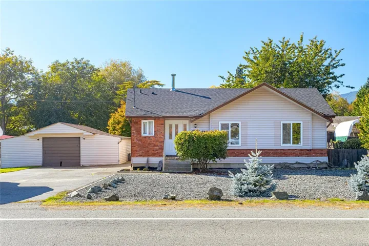 Your Private Paradise Awaits! Nestled just minutes from downtown Chemainus, lovingly maintained 2-bed 1-bath rancher offers peace, privacy & endless potential on a level 0.72-acre lot backing onto green space. Roof replaced 2017. Inside enjoy modern updates including thermal windows, heatpump (2020) & cozy new wood-burning insert (2020). Open plan living area features new kitchen – cupboards/counters & center island (2022), large windows & sliding door leading to a covered patio, perfect for indoor-outdoor living. The landscaped yard boasts fruit trees, garden beds & a stream running through the property ideal for relaxing or entertaining. A 20’x28′ workshop, detached garage, and RV/boat parking add value, while flexible R3 zoning opens doors for future development. Backing onto Mount Brenton Golf Course with trail access & close to Fuller Lake, schools, shops, beaches, this is rural living with urban convenience. A rare opportunity for hobbyists, investors, or first-time buyers alike!
