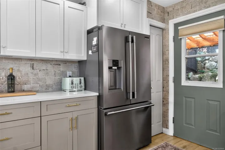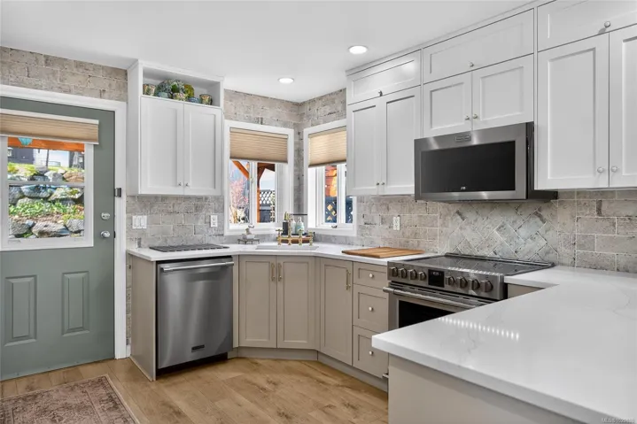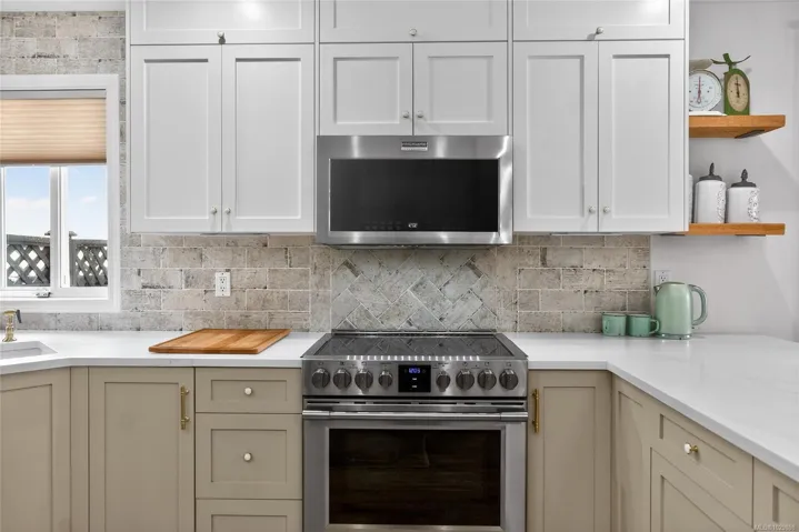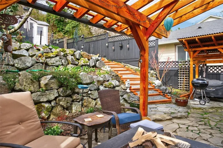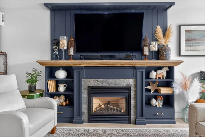 Beautifully renovated luxurious 3 bedroom, 3 bathroom half duplex offering stylish finishes and comfort. The elegant living room features a custom built natural gas fireplace with mantle, bookshelves, and drawers, framed by a large picture window capturing mountain views with motorized remote control blinds. The stunning kitchen showcases quartz countertops, stainless steel appliances, and custom backsplash with access to a private backyard with pergola, perfect for relaxing. The primary bedroom includes closet organizer, ceiling fan, and refined 4 piece ensuite with quartz countertops. The lower level offers a separate indoor entry, spacious family room and bedroom with its own kitchen. The laundry room is located downstairs along with a 3 piece bath featuring custom tiled walk-in shower. New heat pump installed. All custom blinds included. Located on a quiet cul-de-sac close to schools, parks, trails, and town. All msmts approximate, verify if important.