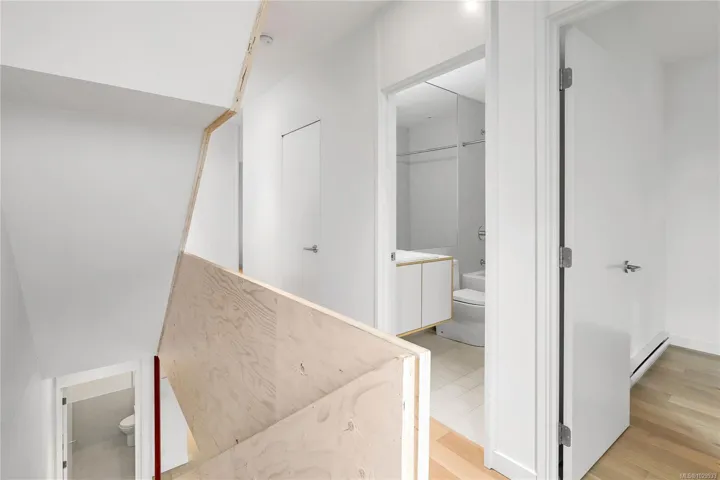 This award-winning Pearl Block townhome offers modern design, quality craftsmanship, and architectural distinction. Designed by D’Arcy Jones Architects and built by Aryze Developments in 2020, this 3-bedroom, 3-bathroom home is part of an exclusive 6-unit boutique complex. Defined by its striking cantilever design, it features exposed steel, glass, and plywood accents, complemented by polished concrete and white oak flooring. The open-concept layout includes a sleek kitchen with a large island, integrated cabinetry, premium built-ins, and a balcony for morning coffee. A highlight is the 400 sq ft private rooftop patio, accessed via a hydraulic glass hatch—perfect for entertaining or relaxing in the hot tub with mountain views. Additional features include a custom bar with wine fridge, extended garage with EV charger, and onsite Modo car share. Located on a tree-lined street near schools, parks, transit, and Hillside Mall.