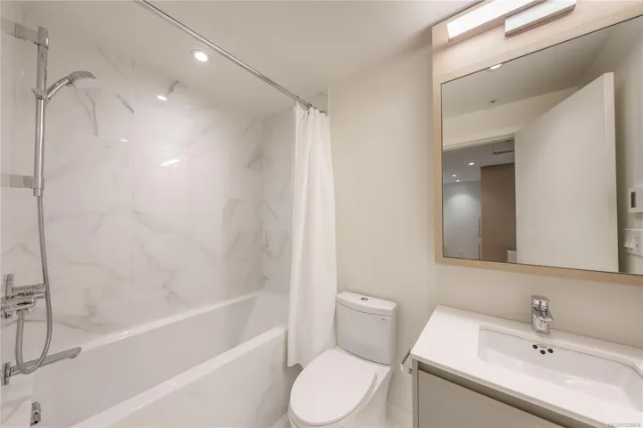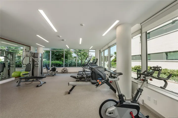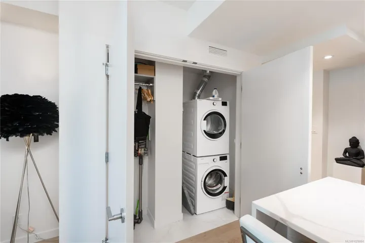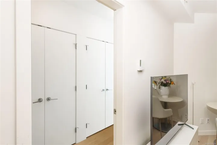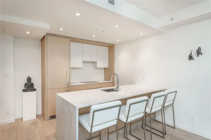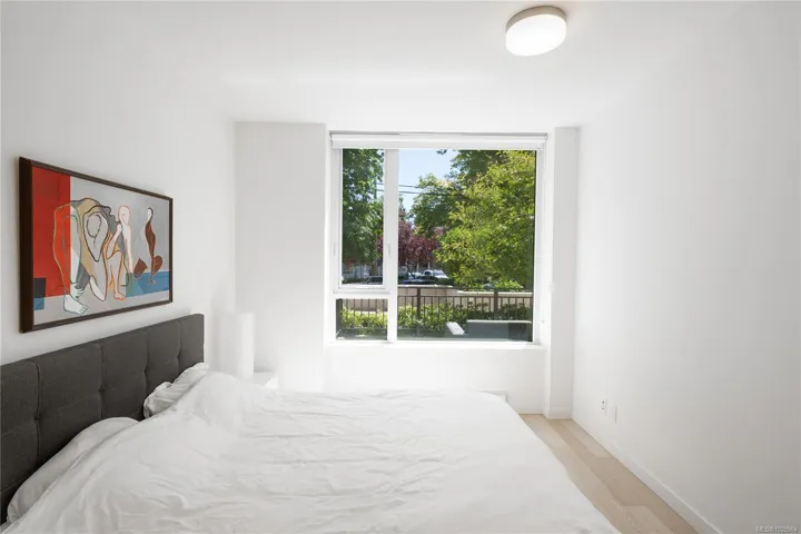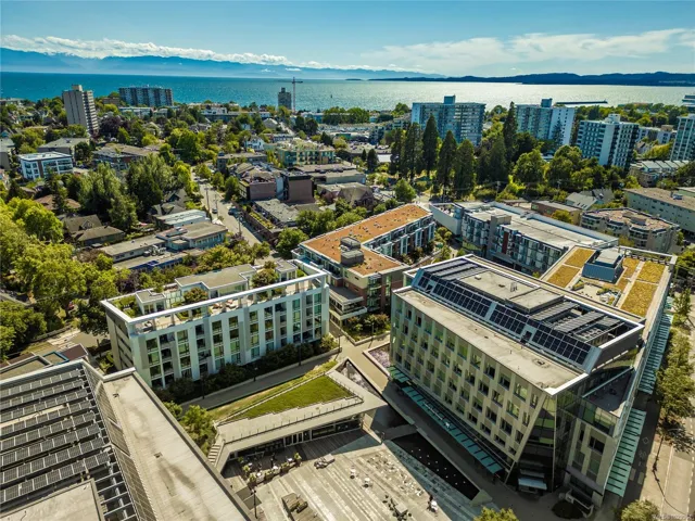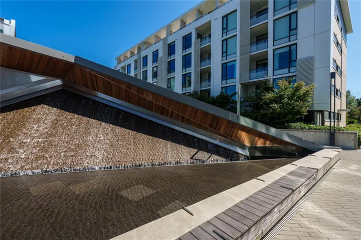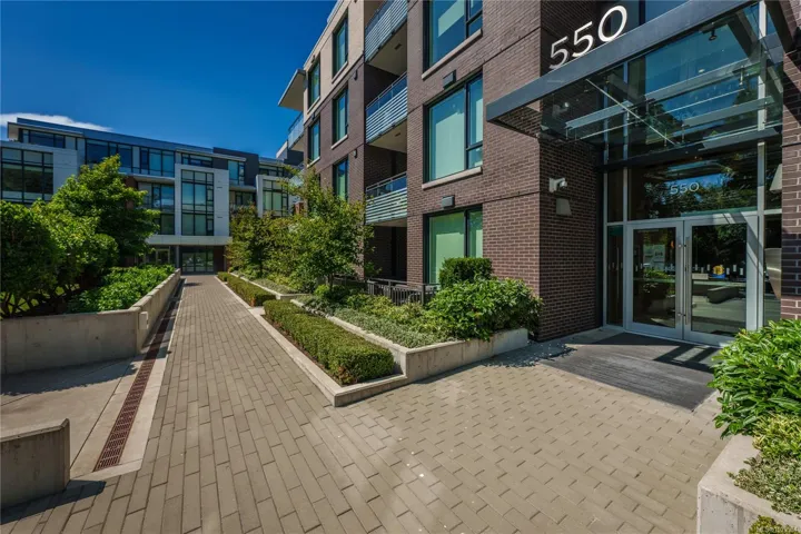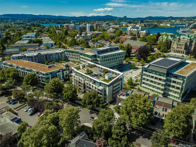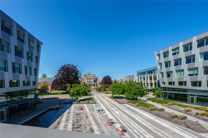 Welcome to Capital Park, a boutique 5-storey steel & concrete development built to the highest standards. Enjoy inviting courtyards, peaceful walkways & calming water features, all nestled in charming James Bay, just steps from the scenic Inner Harbour. This south-facing home offers a convenient townhouse-style private entrance through a spacious 151 sq.ft fenced & gated terrace surrounded by lush landscaping. Inside, white oak flooring flows throughout, with in-floor electric heating in the bathrooms for added comfort. The modern kitchen features flat-panel cabinetry, quartz countertops & backsplashes, a striking quartz waterfall island & fully integrated Bosch appliances designed for easy cooking & entertaining. Residents enjoy exclusive access to a stylish lounge opening onto a large terrace & a well-equipped fitness studio. Secure underground parking provides indoor access to Red Barn Grocery & the Victoria Public Library. Enjoy sophisticated living in an exceptional location.