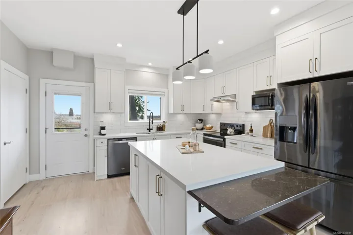 Central Nanaimo Executive Townhome – a Rare Live/Work Opportunity! Bright, stylish and updated 2 Bed/4 Bath Executive Townhome with Retail Suite in “The Seven” offers modern living in the Old City Quarter, just a short walk to downtown bars, eateries, and urban amenities. Unique zoning allows commercial business, permits short-term rentals, and welcomes pets. Ideal for first-time buyers, downsizers, investors, or running home-based business. Sophisticated townhome features large windows, distant ocean views, contemporary finishes, two ensuited Bedrms, and a balcony. Bright open-concept main level offers Living/Dining area with hardwood floors, Kitchen with quartz counters, subway tile backsplash, island, pantry, and black stainless appliances. Upstairs are two ensuited Bedrooms with WI closets – Primary offers ocean views and Second has Murphy Bed. Laundry also located here. Ground-level Business Suite has separate entry, Kitchenette, and Bath. Visit our website for more info.