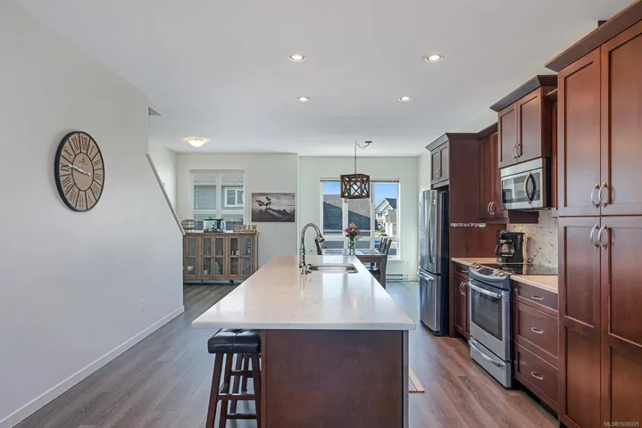 This three-story townhome is a fantastic opportunity to own in a well-established neighbourhood with a smart layout and comfortable living spaces. The main floor features an open-concept design with large windows and high ceilings, creating a bright and inviting atmosphere. The kitchen is both stylish and practical, offering stone countertops, stainless steel appliances, and ample storage. Step onto the deck off the living room to enjoy views of a peaceful pond, often visited by ducks, herons, and eagles. Upstairs, you’ll find a spacious primary bedroom with a three-piece ensuite, two additional bedrooms, and a full four-piece bathroom. The entry-level floor offers added versatility with a bonus room and walk-out access to a covered patio—perfect for guests, hobbies, or a home office. Recent upgrades include a new hot water tank, adding extra peace of mind. With a great location close to schools, shopping, parks, and recreation, this home offers both comfort and convenience.
