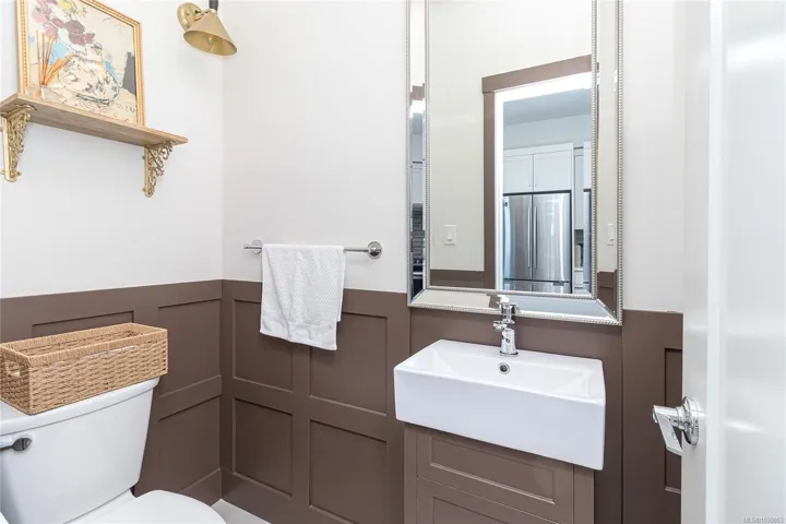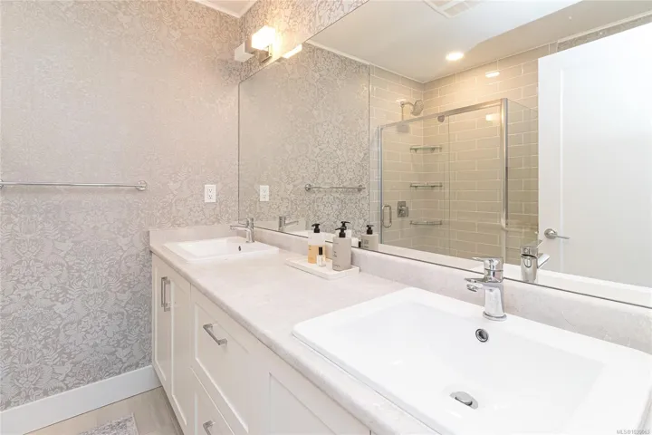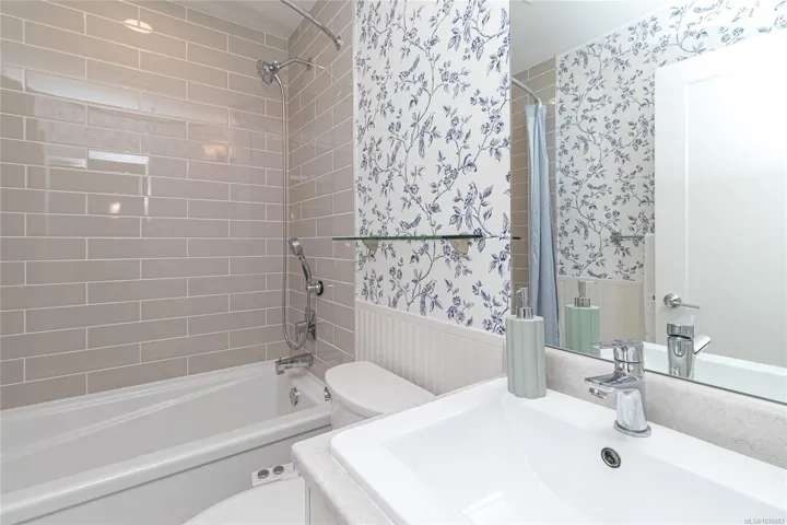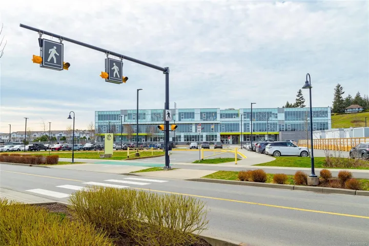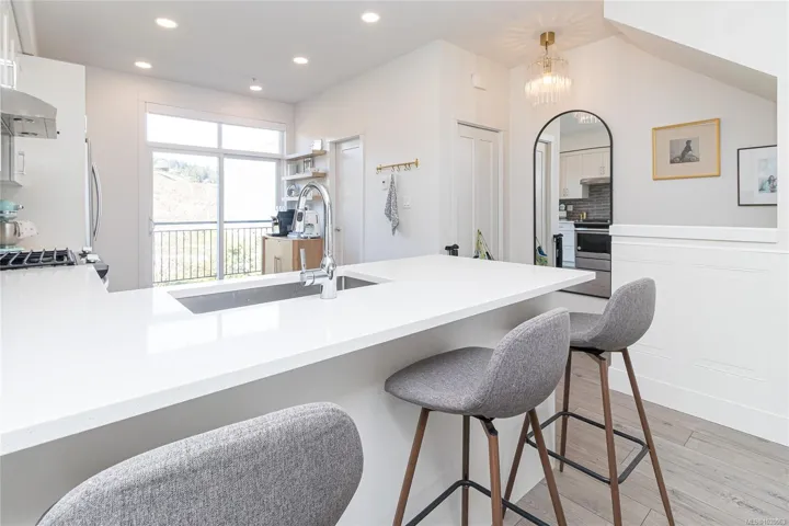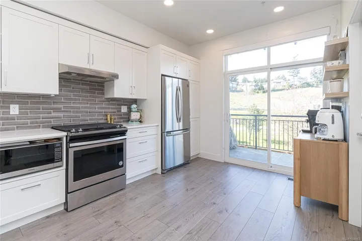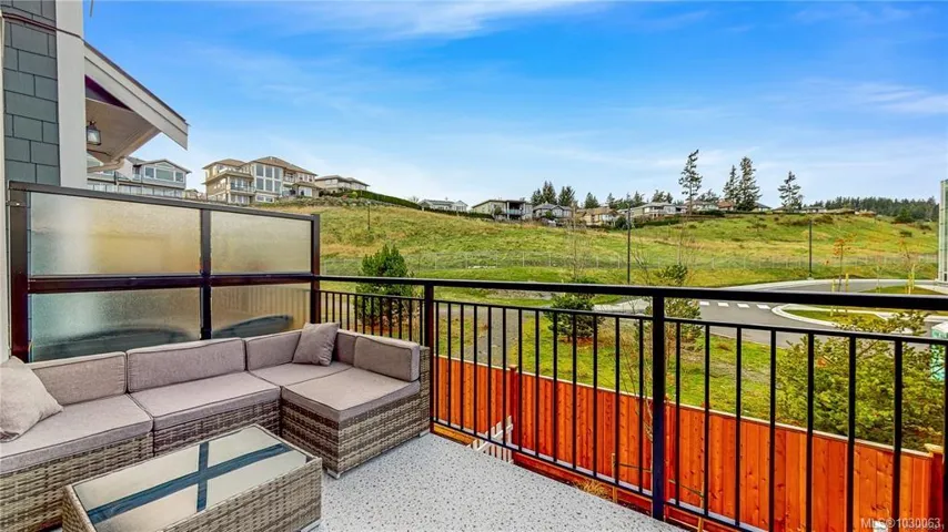 Welcome to your new home at the highly sought-after West Commons! Steps from the ocean, trails, parks, and schools, this well-designed floorplan offers 2 bedrooms, 3 bathrooms, and a versatile den. The bright living and dining area easily accommodates full-size furnishings, while the modern kitchen features quartz countertops, stainless steel appliances, a gas range, pantry, and eating bar—perfect for daily living and entertaining. Thoughtful upgrades include custom shelving, wainscotting, and a built-in electric fireplace. Stay cool with the newly installed heat pump, a rare feature in this complex. The tandem double garage plus driveway allows parking for up to 3 vehicles, with extra space for a workshop, gym, office, or play area. Enjoy outdoor living with a fenced yard, covered patio, and balcony. Walk to Royal Bay Beach Park with volleyball courts, picnic areas, and shoreline access. Rentals and pets welcome—no size restrictions—flexible option for homeowners and investors alike.