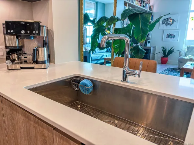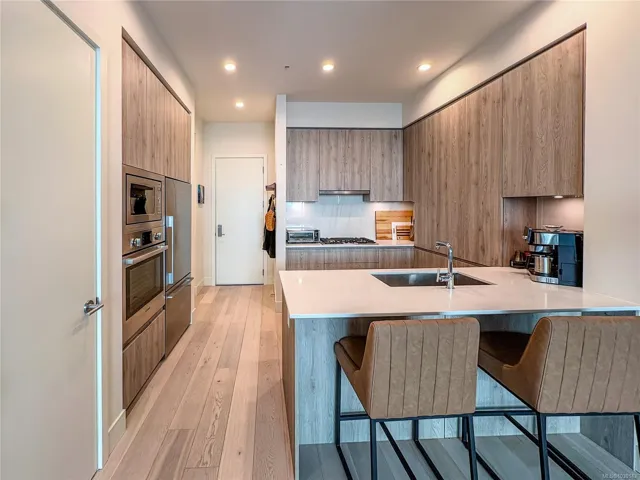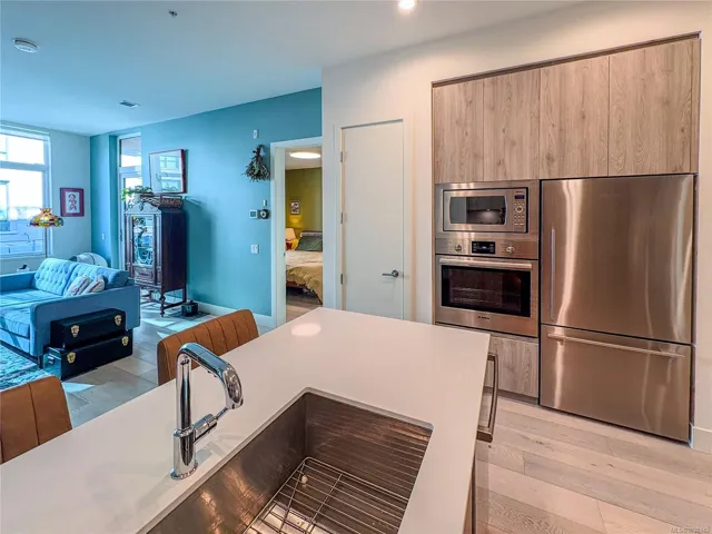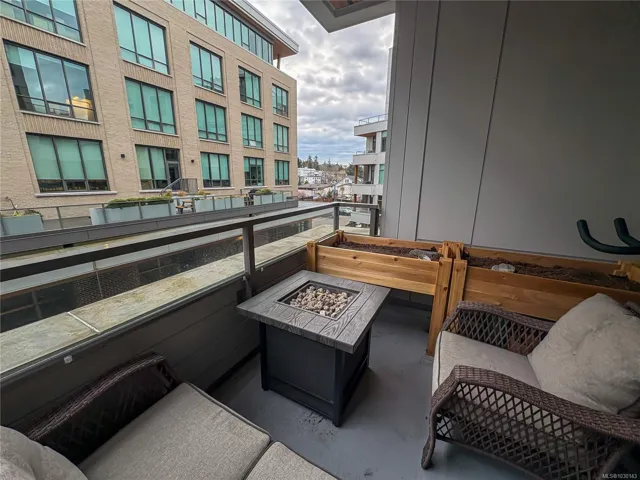 Esquimalt Town Square: a vibrant community in the heart of a welcoming neighbourhood w/shops, dining and cafés just steps away. Or, escape to nature on the Songhees Walkway or Saxe Point Park nearby. This spacious 1 bed, 1 bath home offers 775 sqft of beautifully finished living space. Over-height ceilings & expansive windows flood the home & eng. oak floors w/natural light, airy & inviting. The modern kitchen has ample storage & custom cabinetry, quartz counter & backsplash, stainless steel appliances, & gas range. The living room features a beautiful brick wall, custom built in shelving & desk & a cozy fireplace adding warmth & character. Step outside to your private covered deck w/a gas BBQ hookup. The primary suite offers double closets & cheater access to a luxurious 4 pc bath w/heated floors and deep soaker tub. Enjoy in-suite laundry, underground parking & storage, plus the strata fee covers heating, cooling, water, & gas making this home an exceptional value in today’s market.