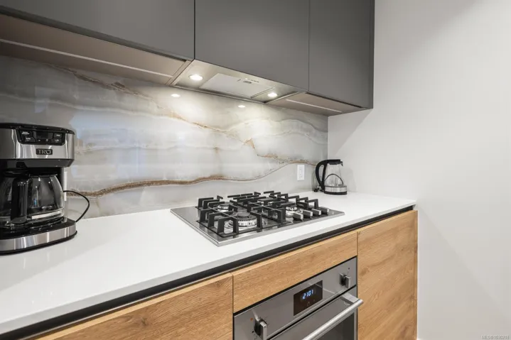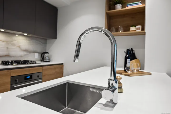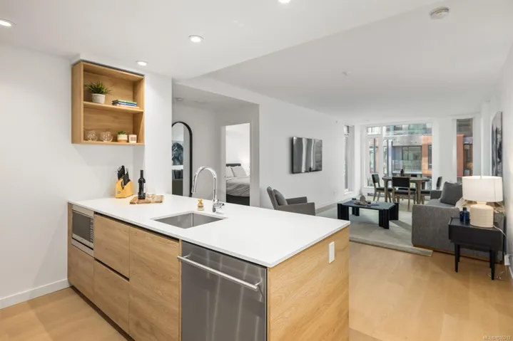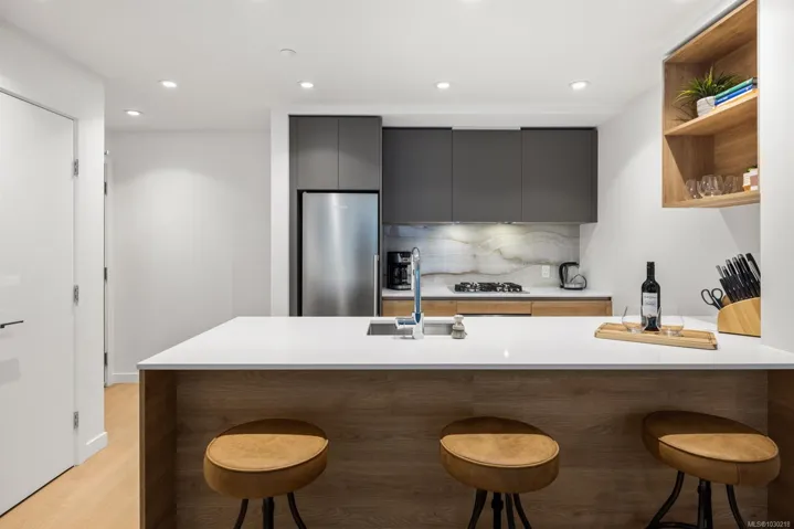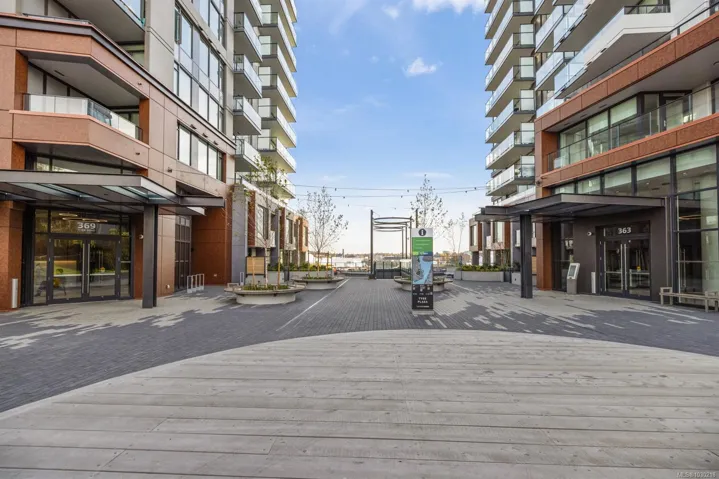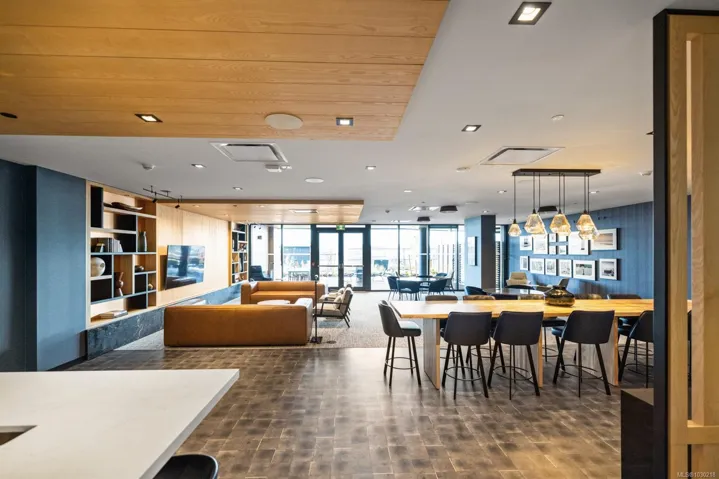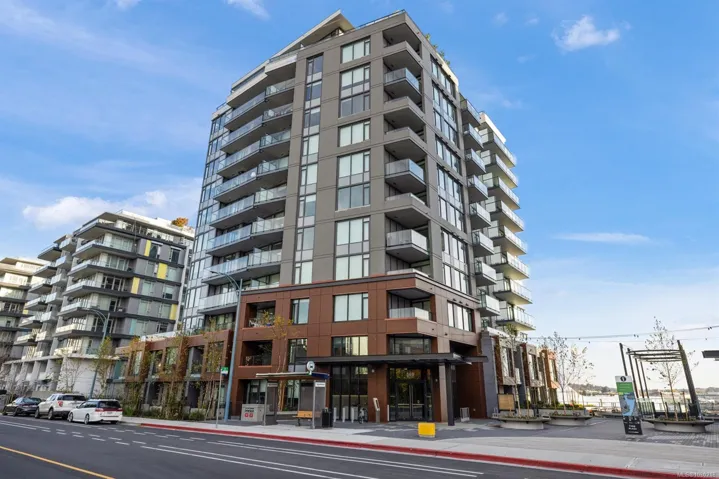 Welcome to Dockside Green- well suited to single professionals or couples seeking a true work-from-home layout. This spacious one-bedroom residence offers almost 900 sq ft of functional living, with a generous den that provides an ideal workspace and room for guests. Expansive windows fill the home with natural light, while the chef’s kitchen features elegant cabinetry, gleaming countertops & refined finishes alongside a spa-inspired bath. A private south-facing balcony offers a quiet outdoor retreat. Enjoy proximity to the Galloping Goose Regional Trail and a setting just outside Downtown Victoria that offers convenient access to the city while maintaining a relaxed neighboruhood feel. Stroll oceanfront pathways or visit nearby cafés, groceries & amenities at Westside Village. Building amenities include a gym, bike service room, pet wash, resident lounge, and rooftop terrace with BBQs and sweeping views. EV-ready parking and separate storage included. Feel good about where you live.