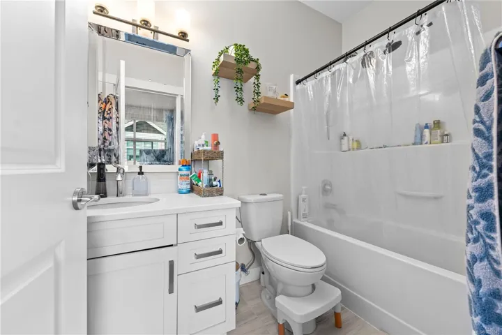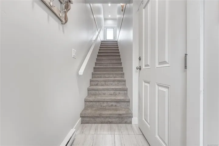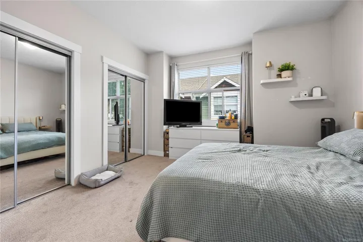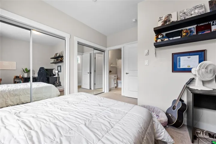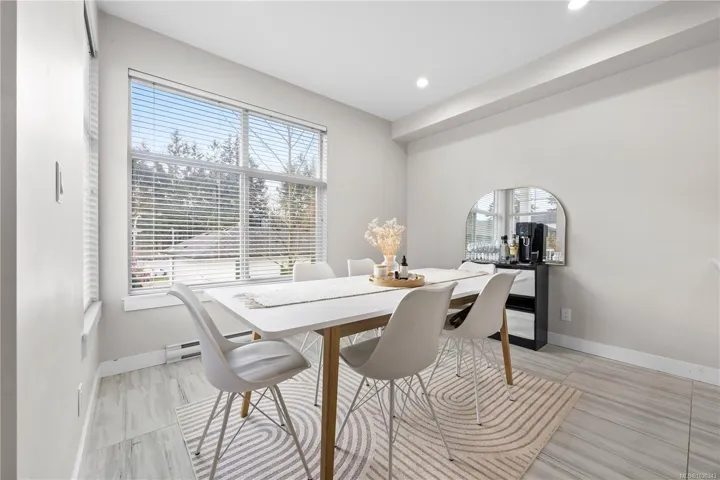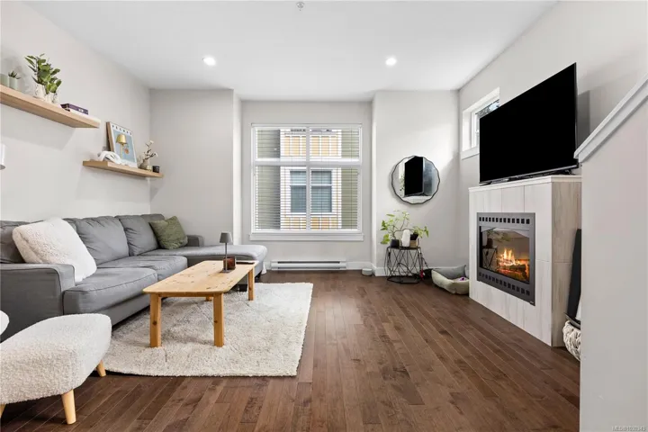 The bright interior shines with 9’ ceilings and rich hardwood flooring. The gourmet kitchen is a chef’s delight, featuring sleek quartz countertops, white cabinetry, stainless steel appliances, and ceramic tile floors. A spacious dining area opens to a sun-soaked balcony, perfect for BBQs. The inviting living room boasts an electric fireplace and cozy window bench seating. Upstairs, discover two primary suites, each featuring its own private ensuite and large closets—ideal for maximum comfort.