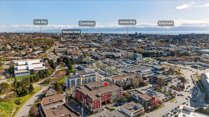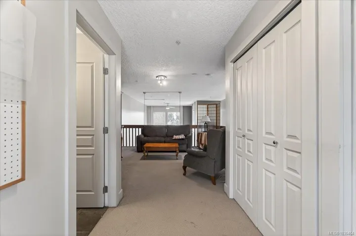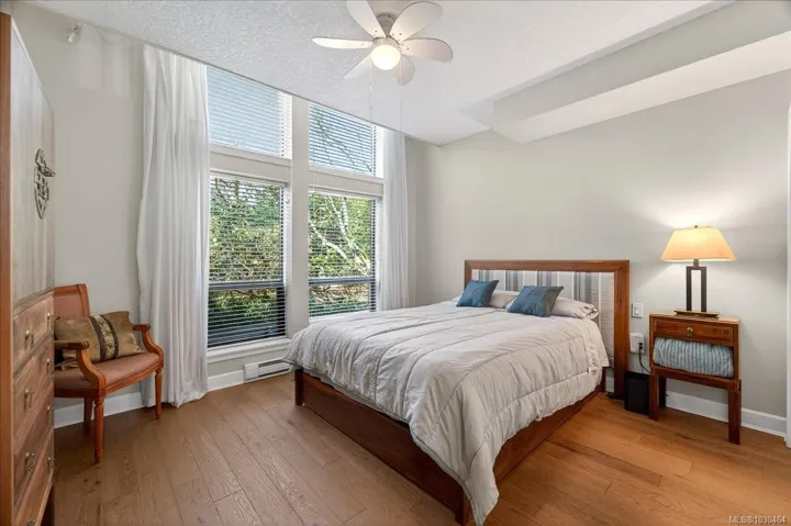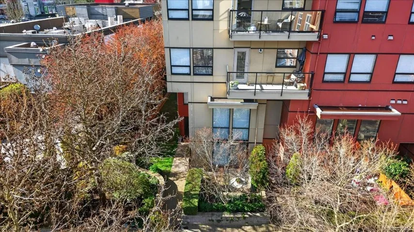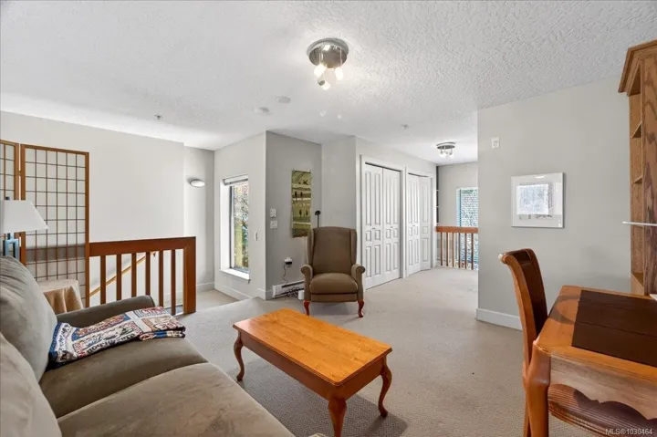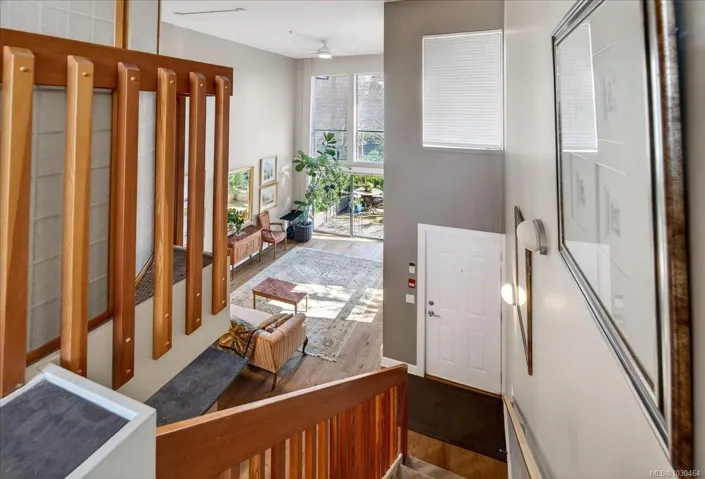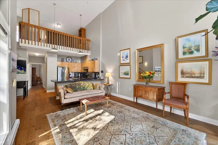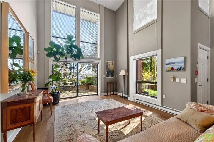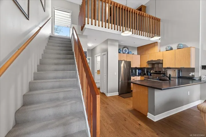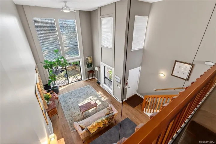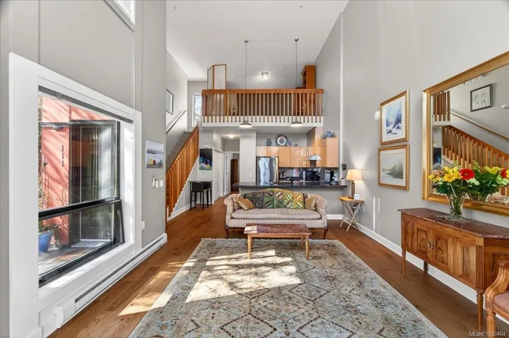 Location!! Bright end-unit loft-style townhome across from Uptown Shopping Centre. Built in 2005, this 2-storey home offers 2 bedrooms, 2 bathrooms over 1,074 sq ft with soaring 17+ ft floor-to-ceiling windows. Open-concept living with vaulted ceilings, wood floors, functional kitchen with custom cabinetry, pantry, quality appliances & eating area. Main floor features a generous bedroom with large windows and extra-large closets plus a 4-piece bath. Upstairs offers a spacious loft-style primary with office area, large closets, and full bath, ideal for flexible living or working from home. Private entrance & patio, in-suite laundry, large storage, underground parking, and pet-friendly. Steps to shopping, transit, Galloping Goose Trail, UVic routes & minutes to downtown.