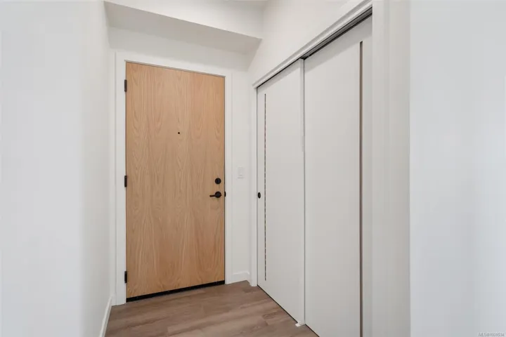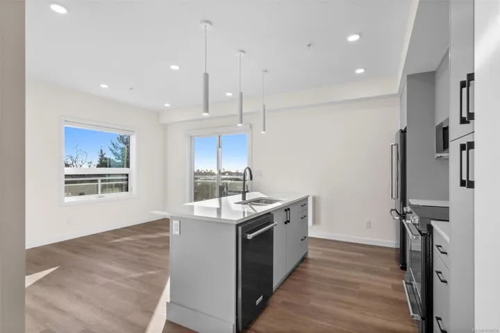 ** Open House – Sat. Apr. 4, 12:00-1:30 ** — a bright and stylish new 2-bedroom, 1-bath corner unit featuring a wrap-around balcony with views of the Olympic Mountains, and the ocean. Expansive windows on two sides flood the home with natural light, creating an airy and inviting atmosphere. The modern kitchen is equipped with KitchenAid appliance package, quartz countertops, and a spacious island perfect for entertaining. The living area offers warmth and comfort with an electric fireplace, with 2 bedrooms, and a four-piece bathroom with in floor radiant heat. Additional highlights include a heat pump with cooling, storage locker, and a secure underground parking stall. Residents enjoy shared amenities such as a meeting room, fitness center, and landscaped courtyard. Ideally situated on an easy bus route to downtown and within walking distance to Saxe Point, grocery stores, Saxe Point Pub, the library, Archie Browning Sports Arena, and more — this is urban living at its best.