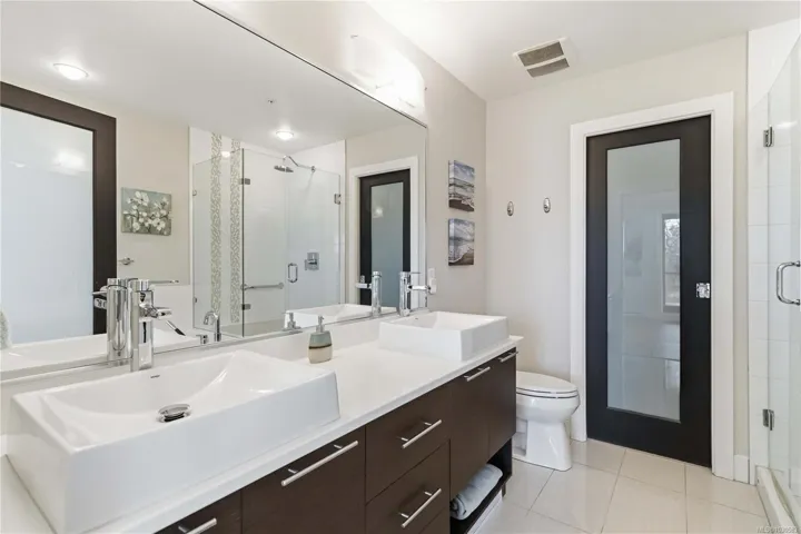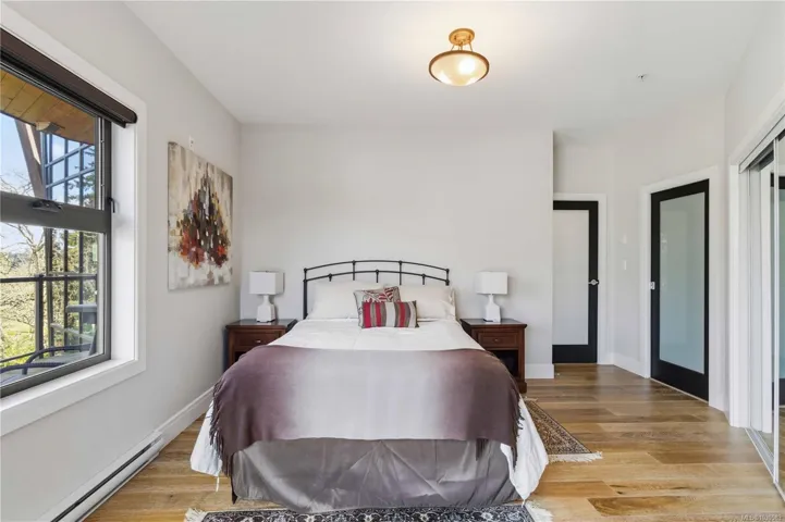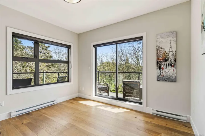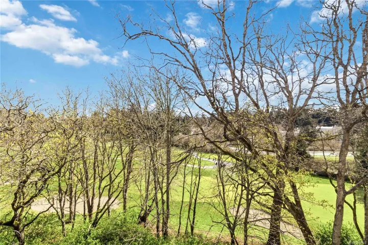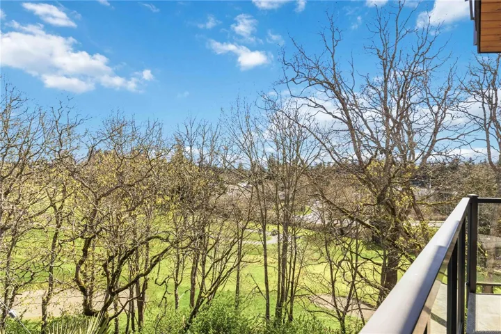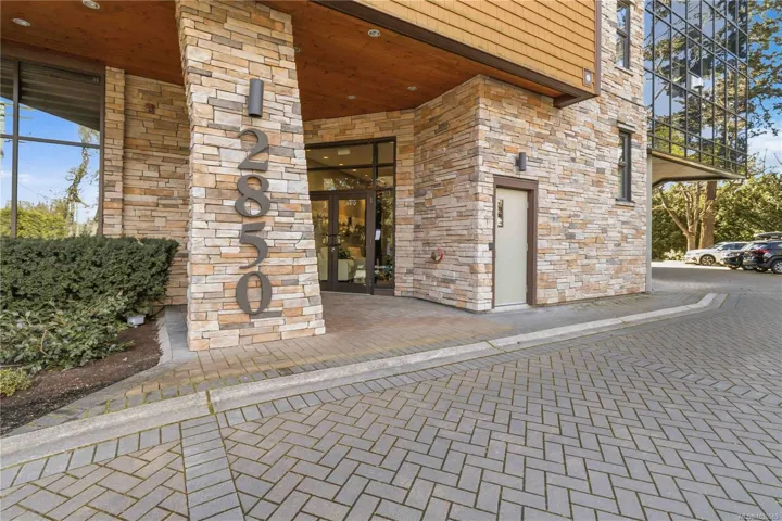 Introducing “The Tree House” a beautifully designed residence tucked away at the end of a quiet cul-de-sac. This southeast-facing corner unit sits along the Royal Colwood Golf Course, with expansive views & natural light through floor-to-ceiling windows. Thoughtfully laid out, this home features 2 spacious beds, 2 baths & 2 sundecks, ideal for relaxing or entertaining. The open living space is enhanced by 9-ft. ceilings, engineered hardwood floors & a stunning three-sided gas fireplace with a stone surround. The kitchen features sleek quartz countertops, SS appliances including a wine fridge, seamlessly connecting to the living & dining areas. The large primary suite includes a WIC & a 5-piece ensuite. Features include heated floors, gas hot water on demand, a heat pump with AC, BBQ hookup & pet-friendly living. One covered parking stall and storage locker included. All of this just a short stroll to the shops, dining & everyday conveniences of charming Goldstream Village.