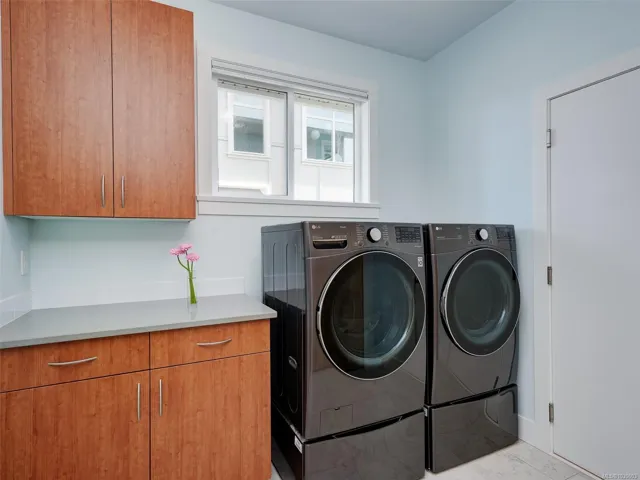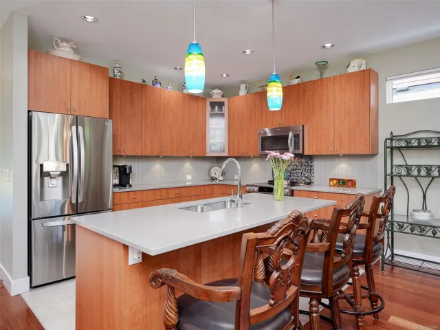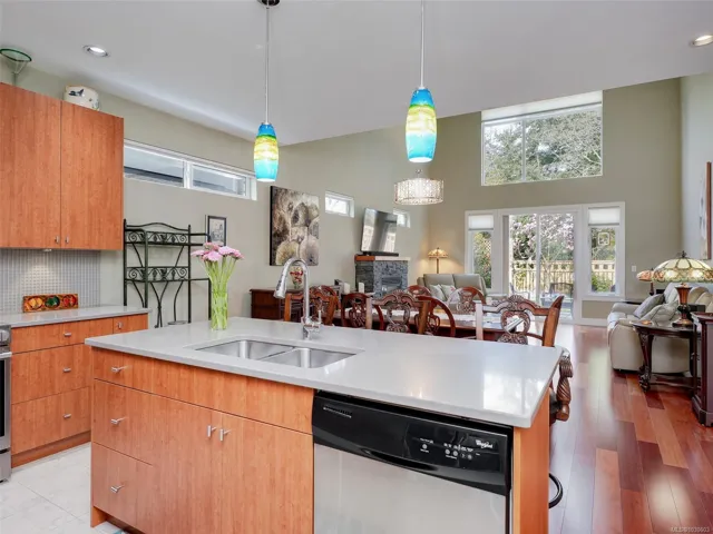 Custom-built for main-level living, this beautifully maintained 13-year-old home shows like new. The bright open-concept kitchen, dining, & living space features gleaming hardwood floors, soaring 18’ ceilings, expansive windows, Hunter Douglas blinds, and state-of-the-art lighting. The well-appointed kitchen offers s/s appliances, an island with a sink, a breakfast bar, and ample pantry storage—perfect for everyday living and entertaining. The main-floor primary suite includes a walk-in closet and a stylish ensuite with a walk-in shower. Upstairs, you’ll find two additional bedrooms, a full bath, and a spacious 20′ x 15′ recreation room—ideal for a home office, gym, or media space. Enjoy year-round comfort with a heat pump and HVAC system. The fully fenced backyard boasts tidy gardens and a large patio for outdoor living. Complete with a large single garage, a double driveway, off-street visitor parking, and a central location—this home checks all the boxes! Strata for private road.