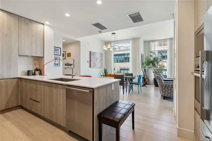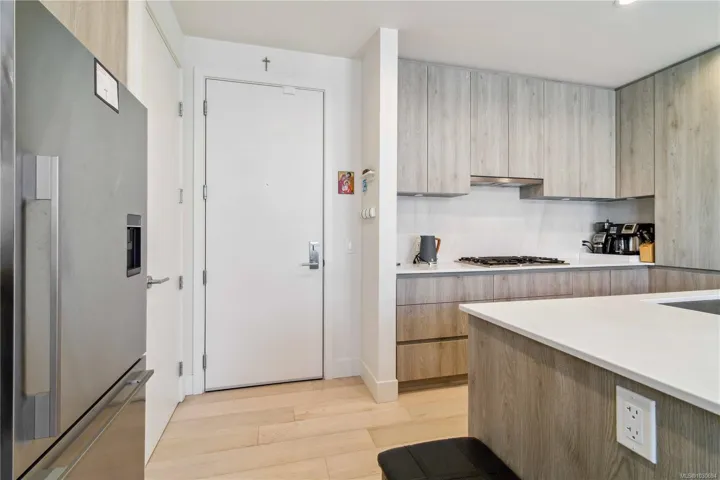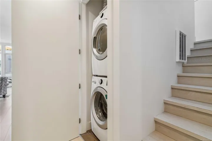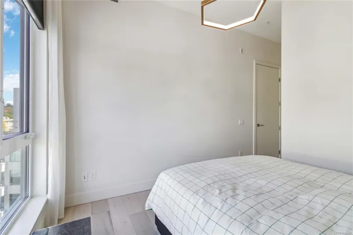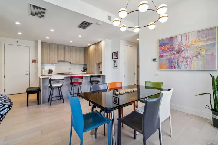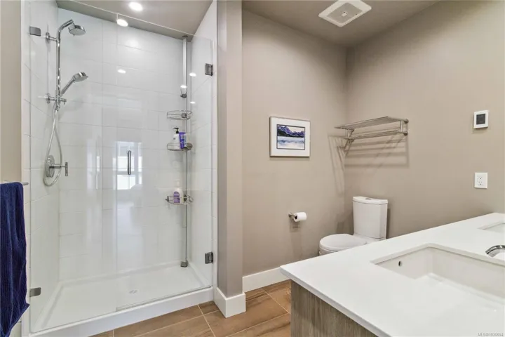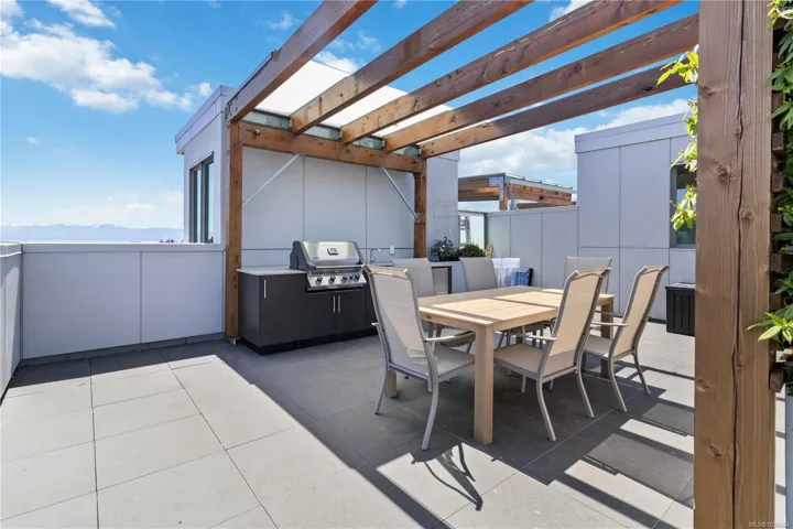 Over 2400 sq.ft of private space for your family to enjoy, with no size limit for dogs, in the vibrant, fast-growing community of Esquimalt, just blocks to the ocean, Saxe Point Park, and minutes to library, restaurants, everyday amenities and downtown Victoria Harbour and the Parliament Buildings, discover a rare offering at The Douglas in Esquimalt Town Square. This 2 bed, 2 bath penthouse showcases over-height 9’6” ceilings, expansive windows, a stunning 1,291 sq ft finished inside with 1200 sqft ocean-view rooftop sundeck with gas, water, BBQ, and floating porcelain tile. Unit features custom built-ins throughout, oak engineered hardwood floors, and a premium appliance package (Fisher & Paykel, Bosch wall oven, gas range, dishwasher), Benson cabinetry and LG washer & dryer. Living room with brick feature wall and electric fireplace. NU-Heat in ensuite. Building offers geothermal heating & cooling, bike room, elevator, parking, bike storage & locker. Coastal living at its best!