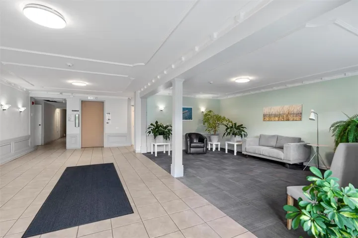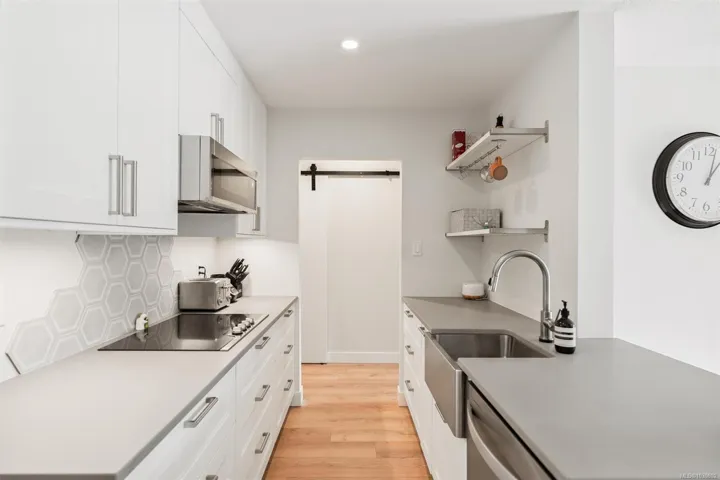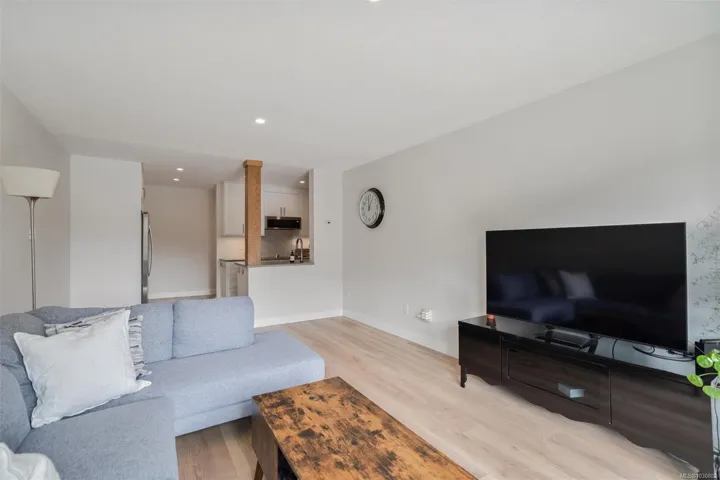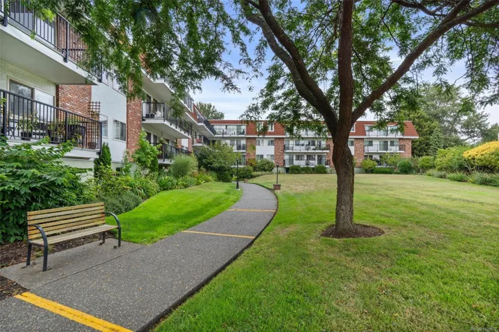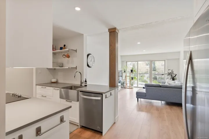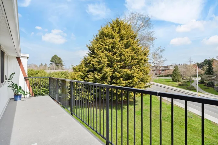 Top floor, beautifully renovated condo near the University! Gorgeous updates throughout including like new laminate floors, kitchen cabinetry, tile backsplash, whirlpool stainless steel appliances and a Frigidaire induction stove. Updated 4 piece bathroom features a tile tub with a rainfall shower-head. In unit washing machine. Modern and neutral finishings with chic barn doors elevate this 1-bed 1-bath unit. Spacious sun drenched private deck off the bright living room with views of Mount Tolmie. The building includes excellent amenities such as a swimming pool, sauna, billiards room, workshop, library and more. Additional storage, 1 parking stall, heat & hot water are included in strata fee. High efficiency boilers in the building were replaced in November 2025. Located in the desirable Cedar Hill neighbourhood just steps from Shelbourne Plaza, bus routes, restaurants, schools and trails. Book your private showing now!