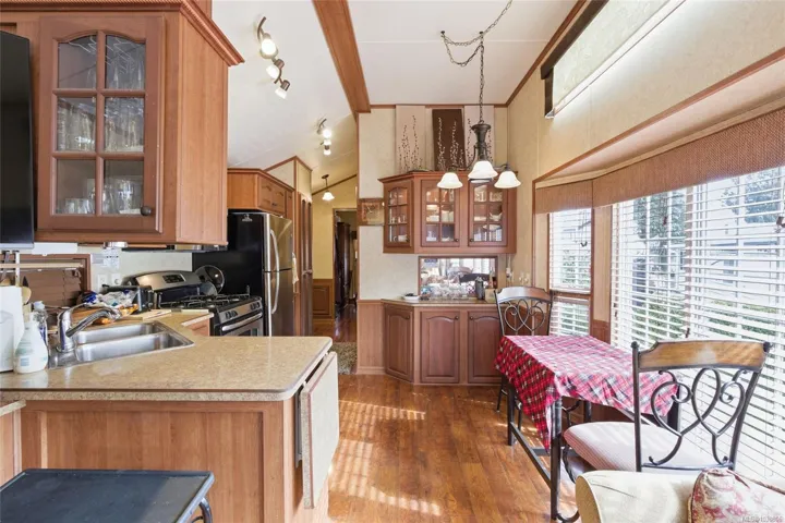 Woodland Park Model at Resort on the Lake! Located at 2118 Buttle Way, this fully furnished and move-in-ready property offers an approx. 30′ x 16′ covered deck with metal roof, parking for up to 3 vehicles, gravel under the home, garden shed, and natural gas BBQ hookup. Inside features include a bedroom with built-in storage, bathroom with shower and built-in storage, electric fireplace, portable A/C, hide-a-bed sofa in the living room, and hot water tank approx. 5 years old. Separate casita includes washer/dryer and room for a guest bed. Resort on the Lake amenities include outdoor pool and hot tub in summer, clubhouse rentals for family gatherings, tennis/pickleball court, exercise room, private access to Westwood Lake trail, and fishing dock. All data approximate.