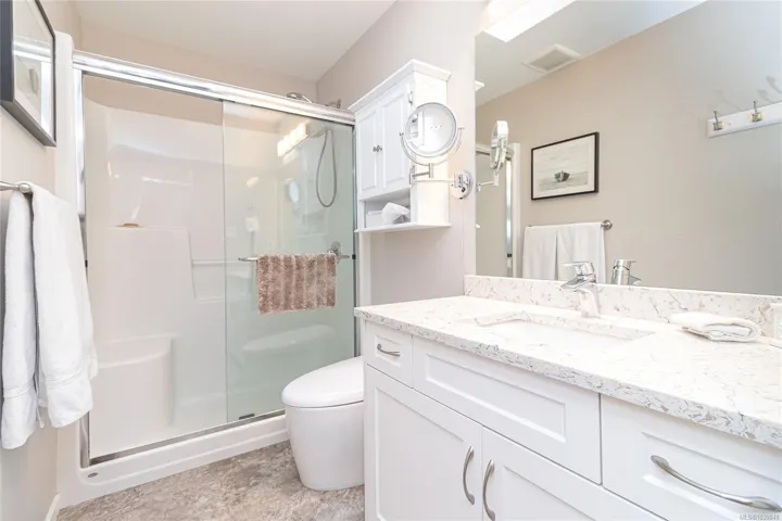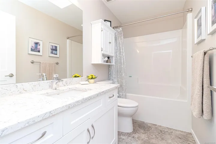 Welcome to starlight Village. Located on Tsawout First Nation lands. Just minutes from the Pat Bay highway in Central Saanich. Close to shopping, dining, transportation & travel. This 2021 built, 2 bed, 2 bath manufactured home offers an excellent opportunity to enter the market at an affordable price. Built with 2×6 construction on a poured concrete foundation with large crawlspace for added storage. Inside features master bedroom with large closet and ensuite, an additional bedroom or added office space. Beautiful and bright with vaulted ceilings, skylights, quartz countertops, stainless steel appliances, durable laminate flooring, stacker washer/dryer and many added upgrades through out. Stay comfortable year-round with a heat pump/A/C & safe with built-in fire suppression system. Enjoy your personal yard space with large glass covered deck great for relaxing & entertaining. No age or rental restrictions, pets allowed (no outdoor cats).Pad fee $520/month,95 years remaining on lease.