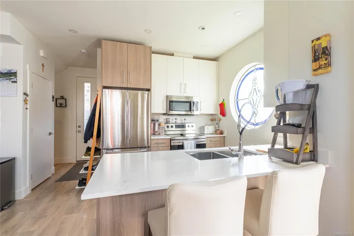 OPEN HOUSE SAT APR 18TH, 2-4pm. Welcome to this bright, modern end-unit 3-bedroom, 3-bathroom townhome in the sought-after Radiant Way community. Offering ~1,359 sq.ft. across three levels, this home features an open-concept layout with a spacious living and dining area filled with natural light. The sleek kitchen includes stainless steel appliances, quartz countertops, and a breakfast bar. A sliding door opens to a private, fully fenced yard with turf, patio, and storage shed—perfect for pets or entertaining. Upstairs offers two well-sized bedrooms, a full 4-piece bath, and in-suite laundry. The top floor is a private primary retreat with a walk-in closet, 3-piece ensuite, and balcony. The unfinished basement provides excellent storage or future potential. Located near trails, parks, schools, shopping, and transit, this home blends comfort, style, and convenience.