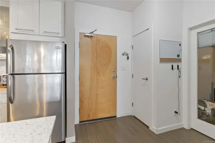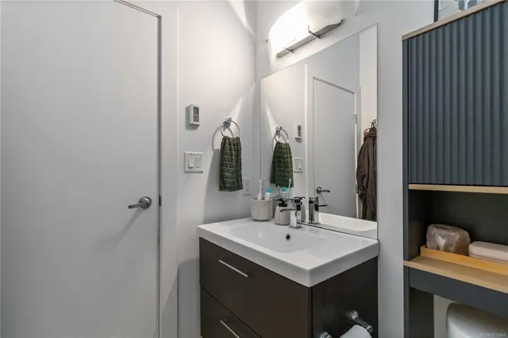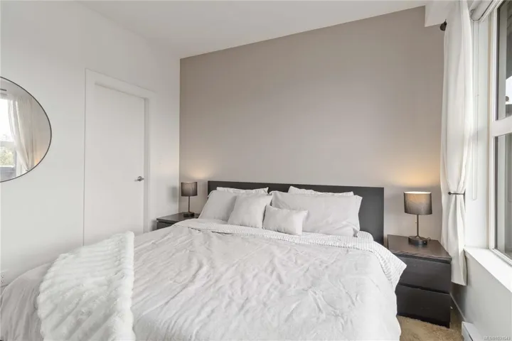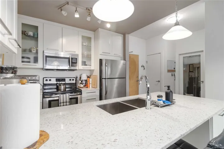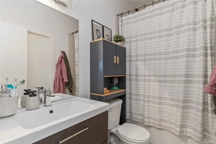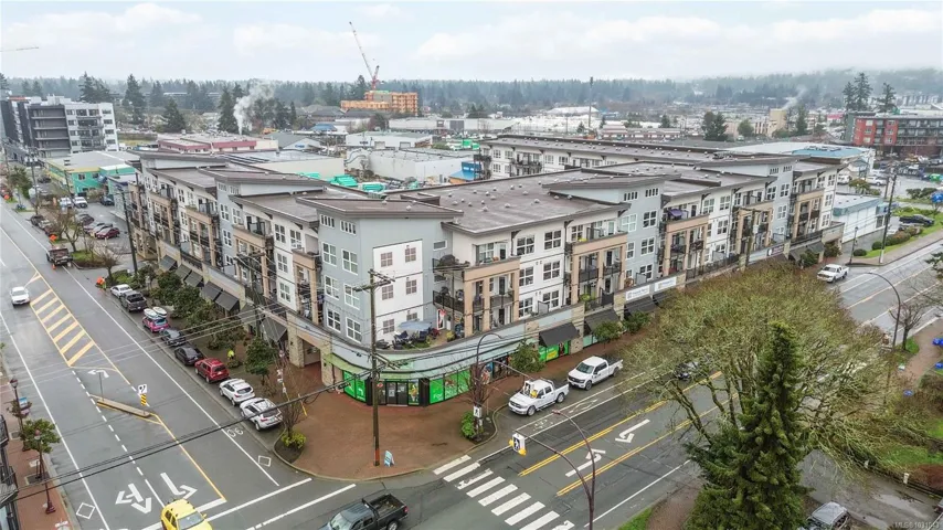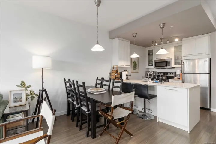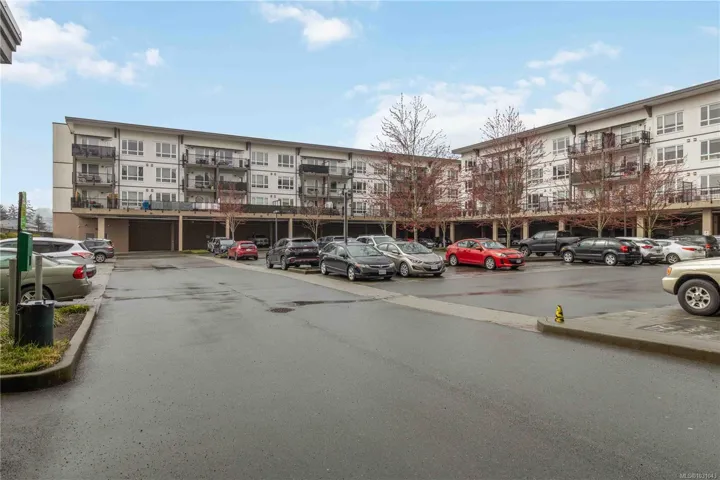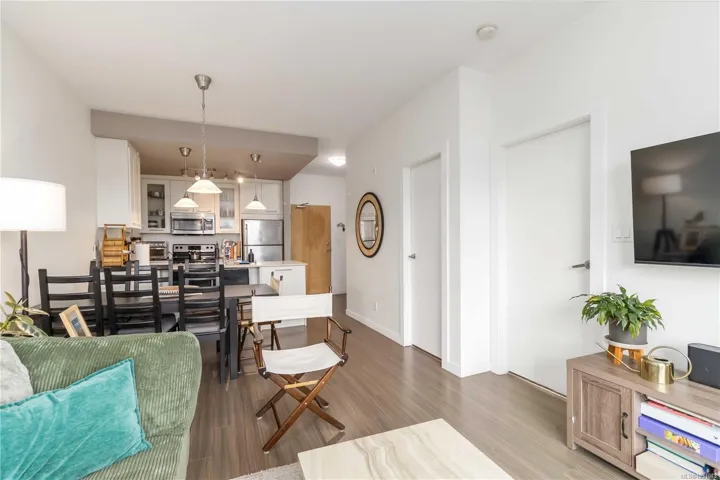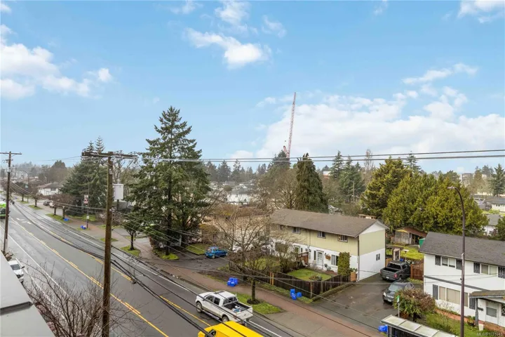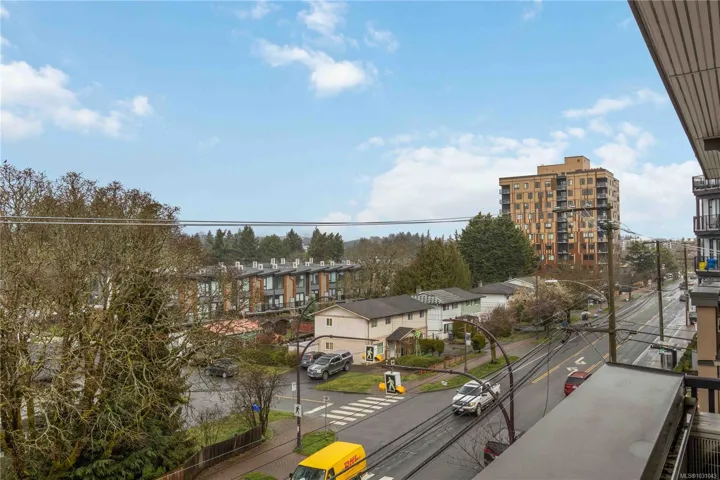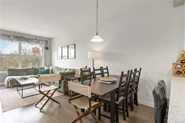 TOP FLOOR with great views! Welcome to Utopia, a modern and well-managed building in the heart of Langford. This 2 bedroom home offers a bright, functional layout with 9’ ceilings and large windows that fill the space with natural light while showcasing beautiful sunset and mountain views. The well-design kitchen with plenty of storage, a peninsula island, quartz counters, and a double sink, flows seamlessly into the living and designated dining areas –perfect for entertaining! Private balcony with southwest exposure. The comfortable primary bedroom features a walk-in closet and cheater ensuite bathroom with heated tile floor for added coziness. Enjoy efficient heating and cooling from a heat pump. 2nd bed/den with closet and fan, great for kids and guests. This home also includes parking, separate storage locker, and in-suite laundry. Pet and rental friendly, just steps to shopping, dining, parks, and transit—an excellent opportunity for first-time buyers, downsizers, or investors.