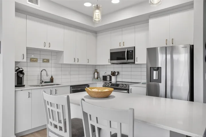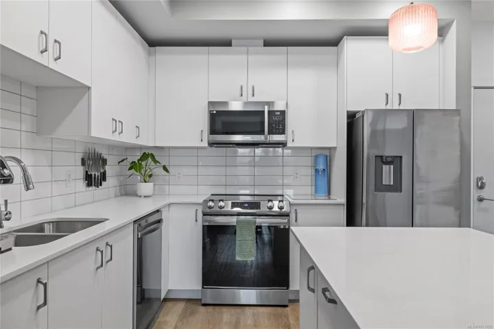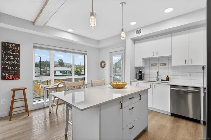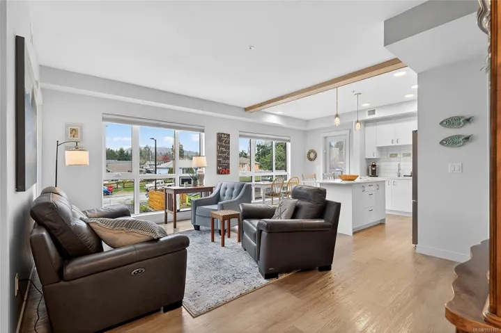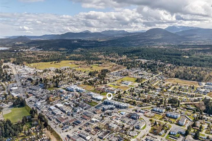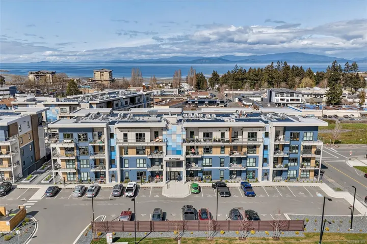 Rare dual-balcony corner unit! This 2023 home at Mosaic offers a lifestyle most units can’t match, featuring two parking stalls (one underground with an EV charger) and two private balconies. Enjoy the quiet south side of the building with mountain views and all-day sun. The interior impresses with a beautiful wooden beam ceiling, solid surface counters, and a large kitchen island. Built to Step 4 of the BC Energy Step Code, this home is 75% more efficient than standard builds. Enjoy year-round comfort with a heat pump for AC and heat, triple-pane windows, and an advanced automated water shut-off system for ultimate peace of mind. This well-managed building includes secured entry, elevators, and bike storage. With 2 beds, 2 baths, and a dedicated laundry room, this pet and rental-friendly unit is steps from Parksville’s best shops and beaches. Superior construction, carbon-free living, and your own EV station make this the premier choice at Mosaic.