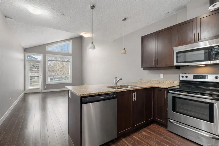 Welcome to Doma—where top-floor living meets everyday convenience in the heart of Langford! This 2 bed, 2 bath home offers nearly 800 sq ft of bright, easy living, with a sunny southwest exposure that brings in beautiful natural light. The open-concept layout is both functional and inviting, with a seamless flow between the kitchen, dining, and living spaces, all enhanced by vaulted ceilings that give it that extra sense of space. Step out onto your private balcony—perfect for a morning coffee or unwinding at the end of the day. Featuring stainless steel appliances, in-suite laundry, two full bathrooms, secure underground parking, and separate storage. Pet friendly, rentable and located just minutes to wonderful amenities—Westshore Centre, City Centre Park, Langford Lake, trails and transit. Walk to everything and come home to your bright top-floor condo! Priced to sell.