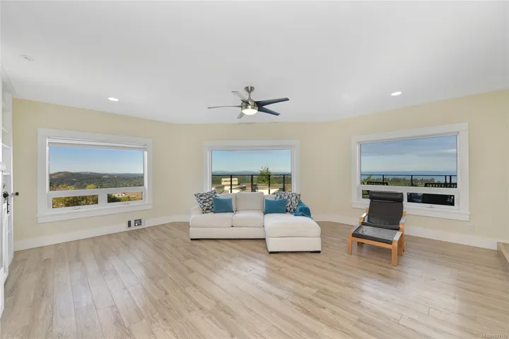 Jaw Dropping Views from this home perched at the top of Triangle Mountain, showcasing sweeping ocean, city, and mountain vistas from every level. Soaring vaulted ceilings and walls of glass flood the interiors with natural light and frame the breathtaking scenery. The open-concept main level flows seamlessly onto expansive decks, ideal for entertaining or quiet sunset moments. Offering over 4,000 sq. ft. of living space plus over 2,000 sq. ft. of deck space. The main level offers a sunken living room with electric fireplace. The upper level features a spa-inspired primary retreat with private patio, while the lower level includes a fully self-contained 2 bedroom suite with private entrance, perfect for extended family or guests.