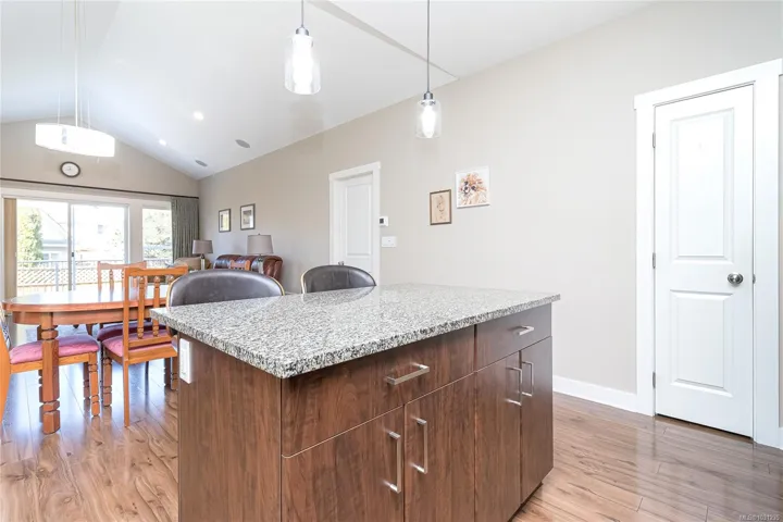 The kitchen features solid-surface countertops, SS appliances, & a functional island, flowing seamlessly into the open-concept dining and living areas with vaulted ceilings. These spaces extend to a west-facing deck & fully fenced, low-maintenance backyard with an underground sprinkler system—perfect for entertaining or relaxing outdoors.