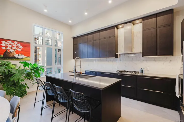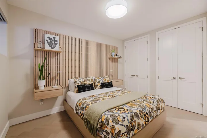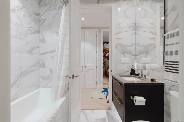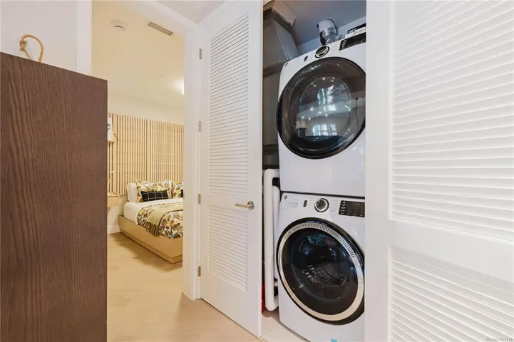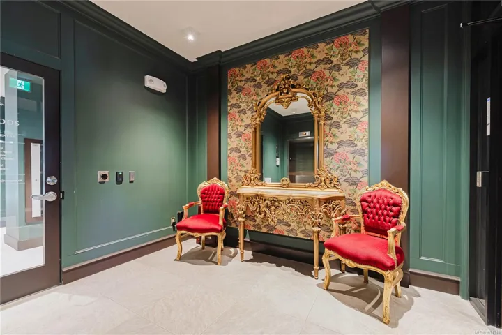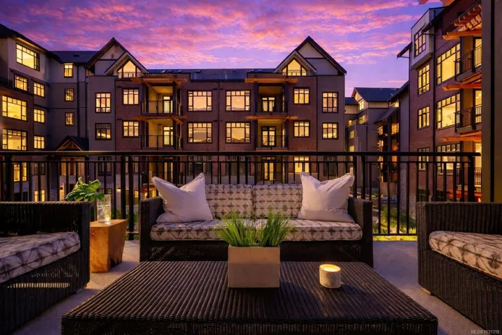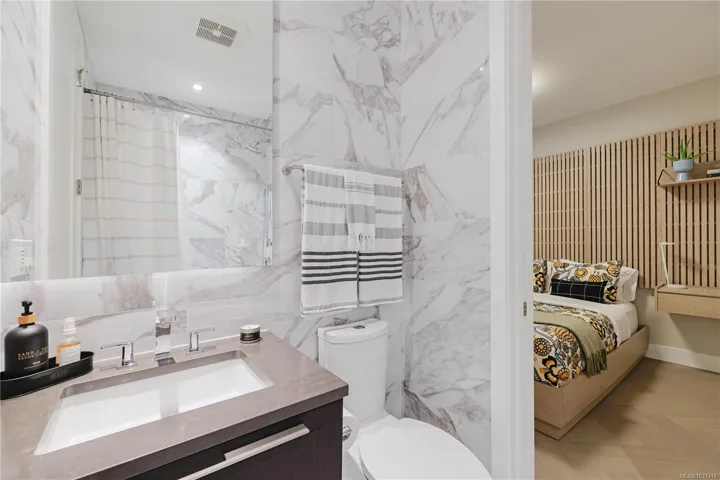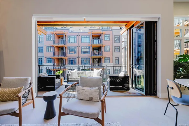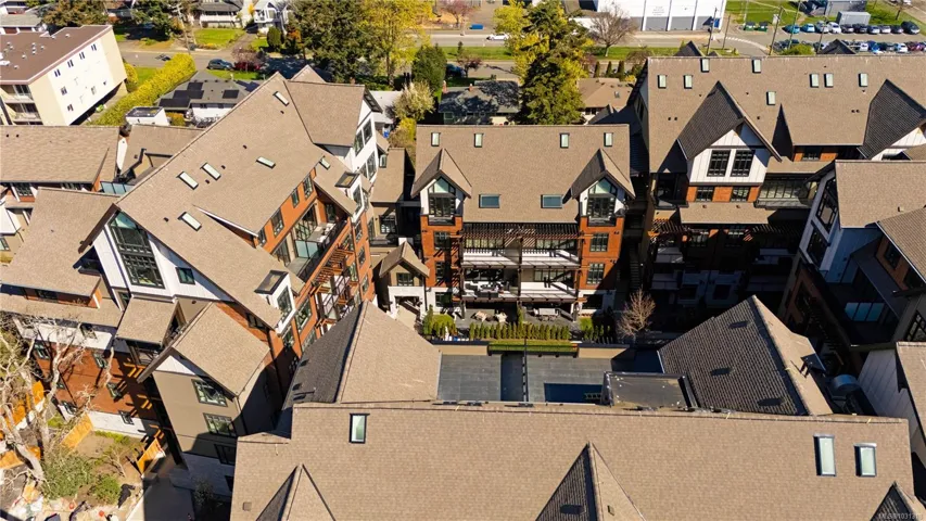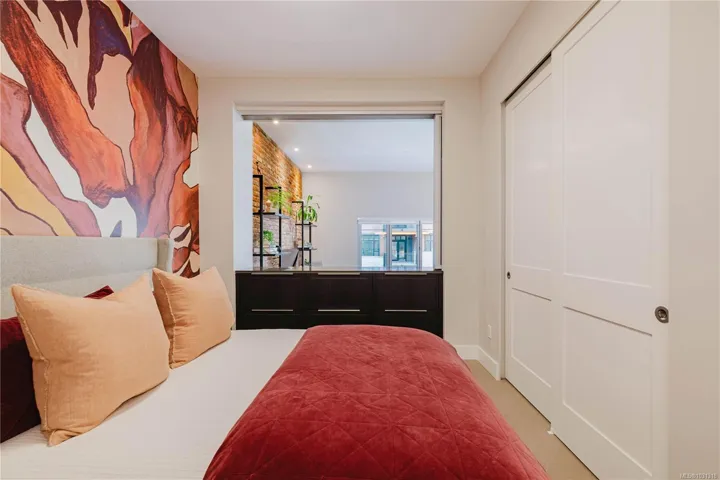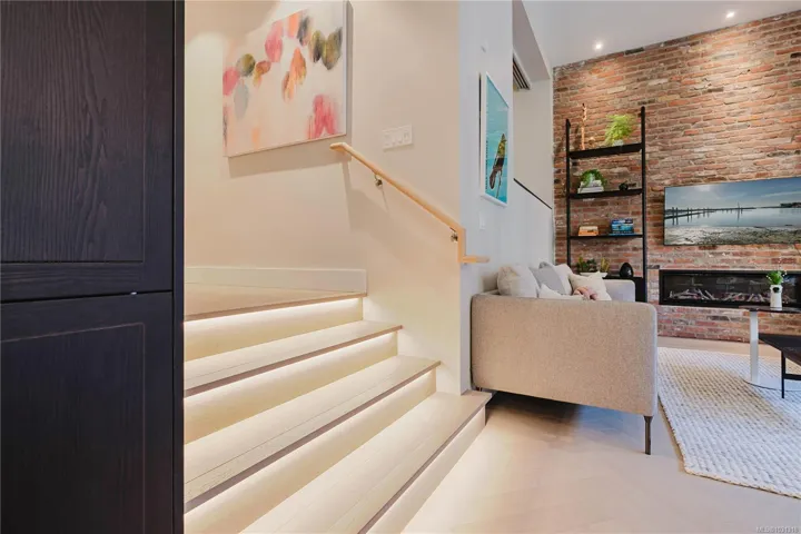 Resale-GST included in the price. 2 bedrooms and 2 full bathrooms in this 1040 square foot unit on the south side of the premier Oakwoods development overlooking the courtyard. A popular unit originally selling in the first week of sales! 8×19 balcony with folding window wall slider door. 2 well separated bedrooms are loft style and have a slider window to open up over the living area below. Living, dining and kitchen have soaring 12 foot ceilings with linear fireplace and restored floor to ceiling brick feature wall. Gourmet kitchen with Italian Bellini cabinets, quartz counters, Kohler fixtures, GE Monogram appliances, plenty of customized storage. Herringbone engineered hardwood floor, geothermal heating & cooling system, storage locker and 1 parking space. The development has a gym, spa, Janevca restaurant and Rosemead Hotel for your guests. Neighbourhood is a beautiful and historic beachside community, steps to Saxe Point Park, shopping and only minutes to downtown Victoria.