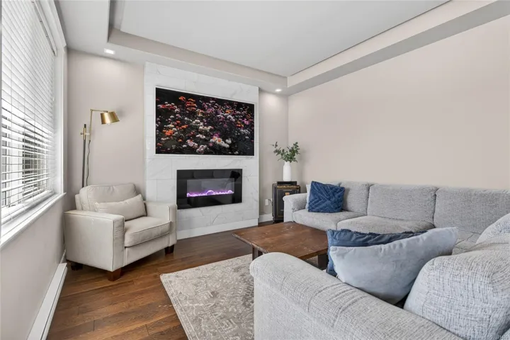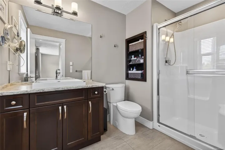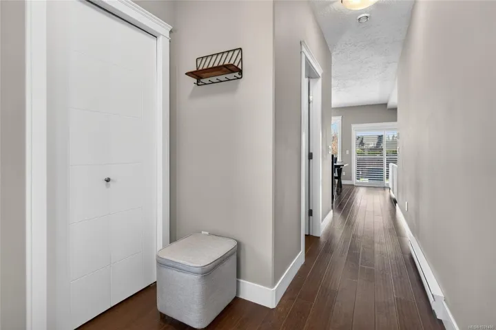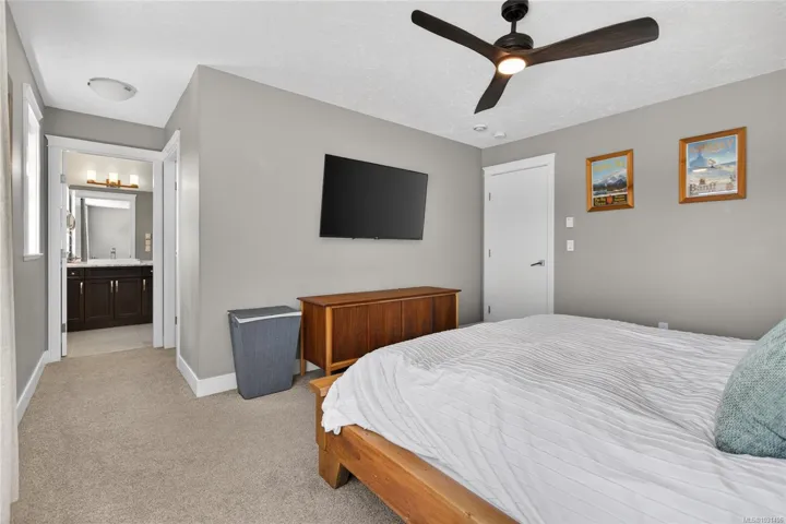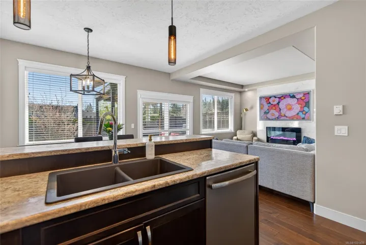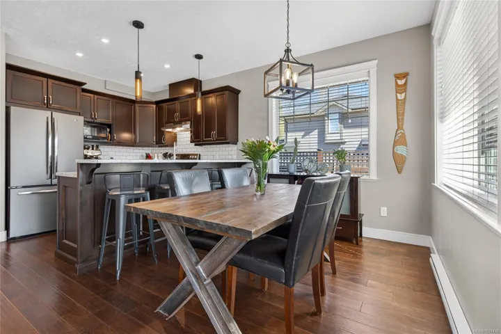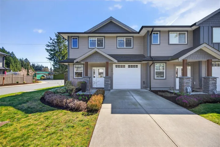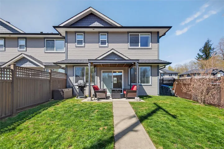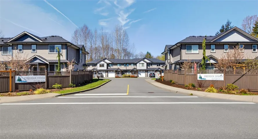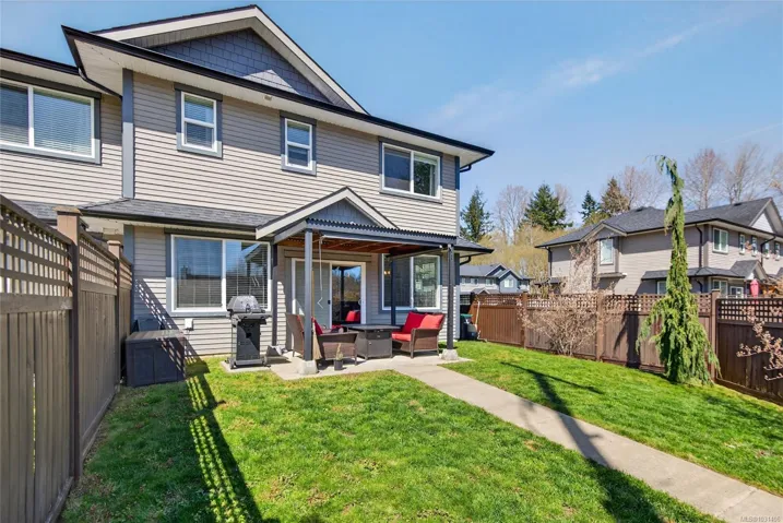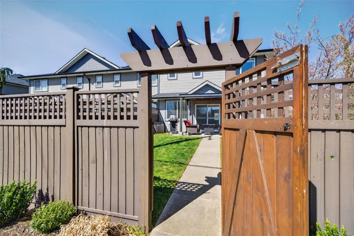Creekside Estates! This charming end unit townhouse offers 3 bedrooms and 2.5 bathrooms, a completely fenced yard, single garage and an extra long driveway. The main level of this home boasts 9ft ceilings, engineered hardwood floors, an inviting eat-in kitchen, custom sliding door shutters, and an electric fireplace with a modern porcelain surround. Back yard is south facing, fully fenced with 2 gates, and has a large patio and gazebo for all season use. Upstairs has an oversized primary bedroom with ensuite, a generous walk-in closet, and has two additional bedrooms and a bathroom that provides ample space for everyone. Convenient laundry upstairs adds to the practicality of this home. Enjoy flexibility with a rental, pet friendly strata, with all ages welcome.