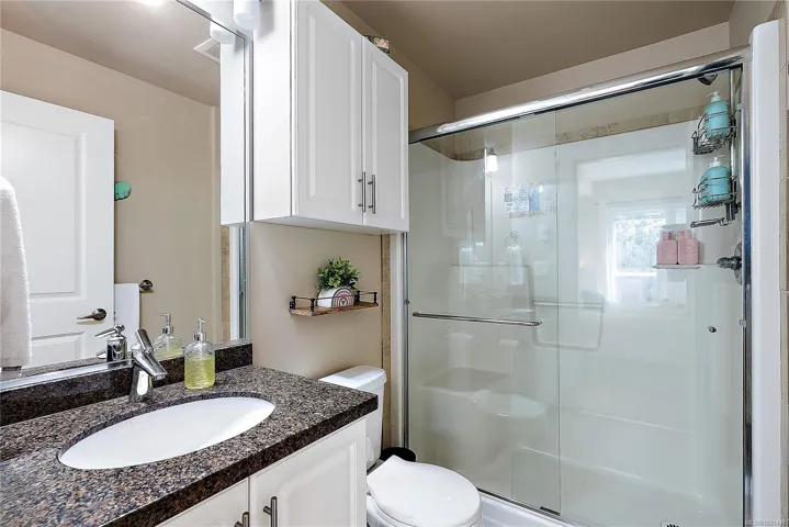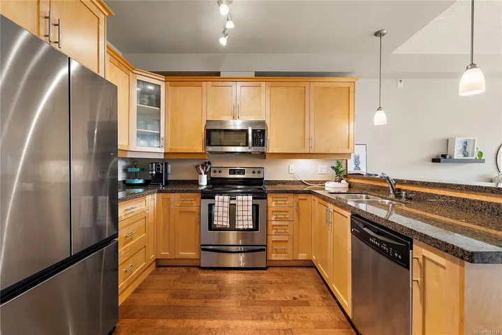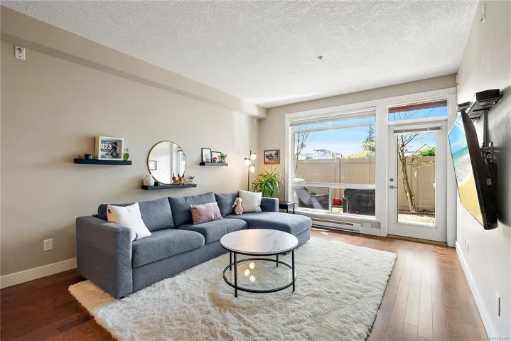 Welcome to the Stonewood- a fabulous concrete & steel building. This ground-floor 2 bed 2 bath suite offers a rare combination of condo convenience & outdoor living. Step directly from your living room onto a large private patio that backs onto open green space of the adjacent school playground, offering a tranquil, park-like outlook w/ no rear neighbours. Inside, the open-concept layout features 9’ ceilings, engineered hardwood flooring & well-appointed kitchen w/ granite counters & stainless appliances (new fridge!). The primary bedroom is generously sized w/ ensuite, while the second bed & 4 pce bath make this ideal for families. Enjoy the convenience of in-suite laundry, secure underground parking & 10 communal guest spots, separate storage, bike storage & a well-equipped gym right across the hall. Pet-friendly & ideally located walking distance to shops, restaurants, transit & all downtown Langford amenities, yet tucked on the quiet end of Jacklin Rd away from traffic noise.