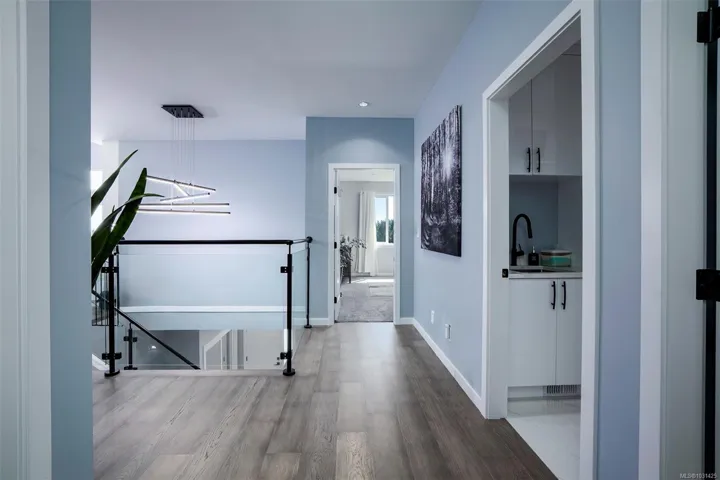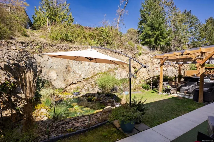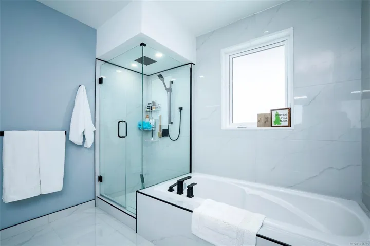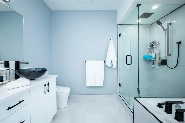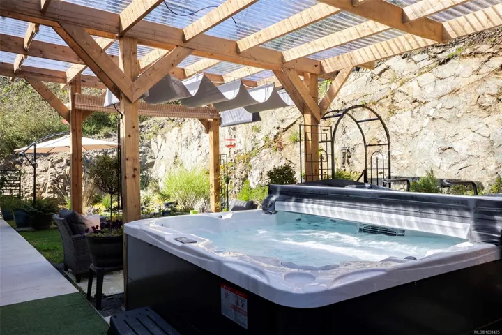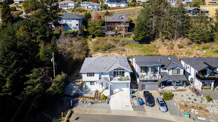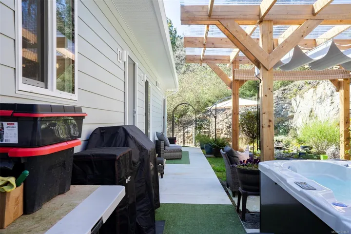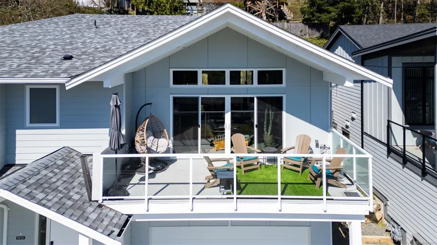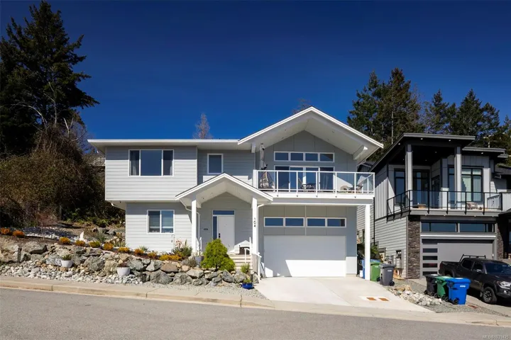 Captivating new build – NO GST. A stunning contemporary with over 3000 sqft of elegance in an open modern design complete with LEGAL SUITE (vacant but did $25,000 income last yr). Offering 5 beds, 3 baths, this beautiful home offers a perfect level of luxury & comfort w/open-concept layout with massive kitchen island, built-in bar cabinet, & a floor-to-ceiling feature wall wgas F/P. High-end Samsung smart appliances & quartz countertops throughout main home. The primary bdrm suite is a gorgeous retreat with a large walk-in closet & a spa-like ensuite featuring a rain shower, steam function, heated floors, & 6’ soaker tub. Home is wired solar-ready w/engineered trusses & is all set with backup generator panel. The private back yard is a real sanctuary with new hot tub, gazebo & pond. 4-camera security system, oversized garage w/Level 2 EV & is solar inverter wired. Covered front deck with ocean & city views, all on a low-maintenance yard in a quiet/friendly neighbourhood. See 3D tour