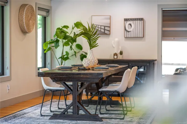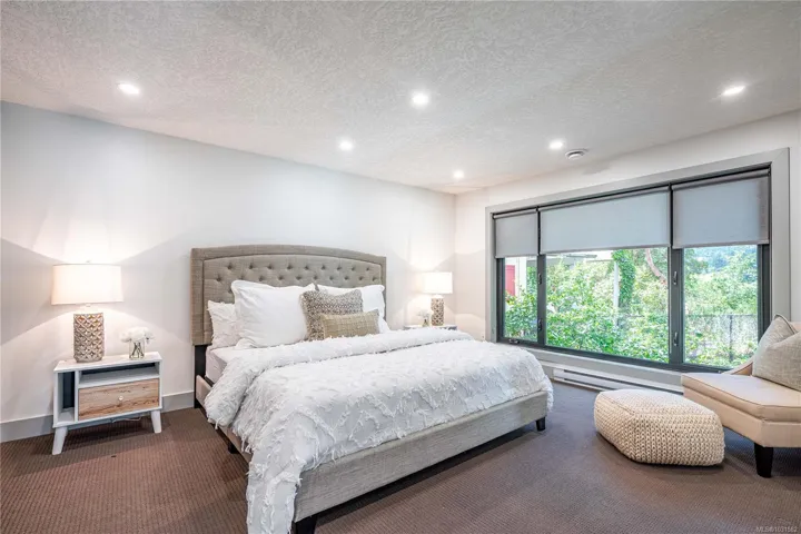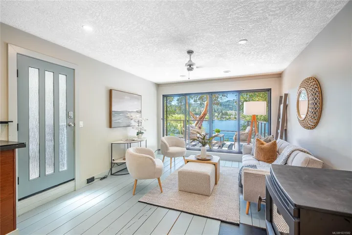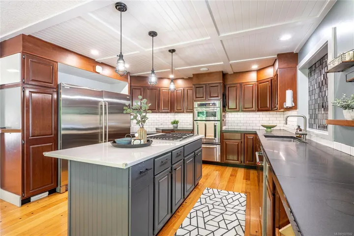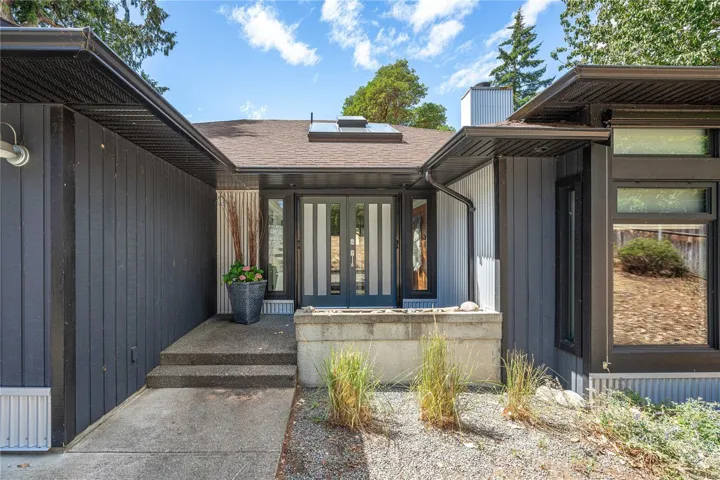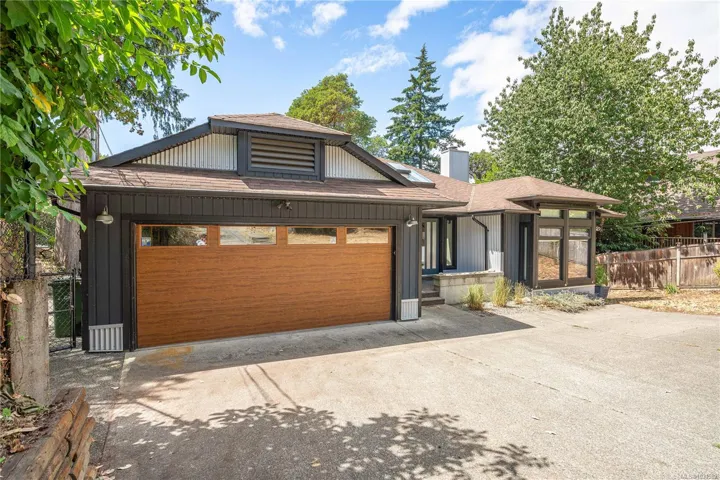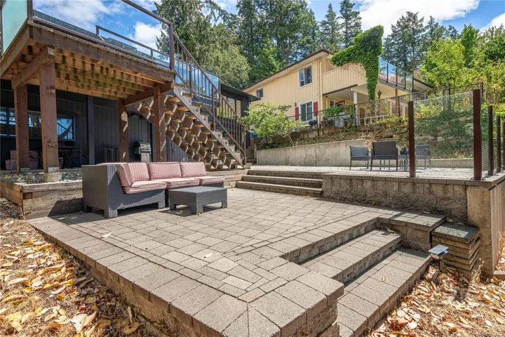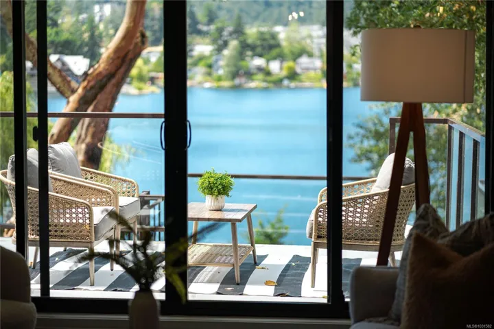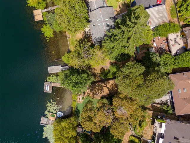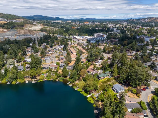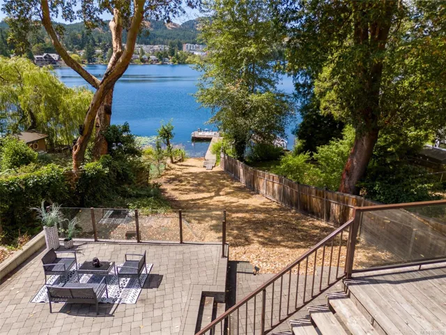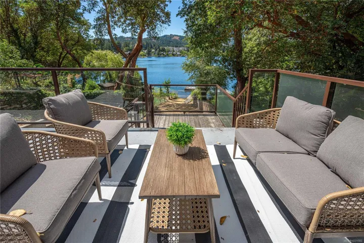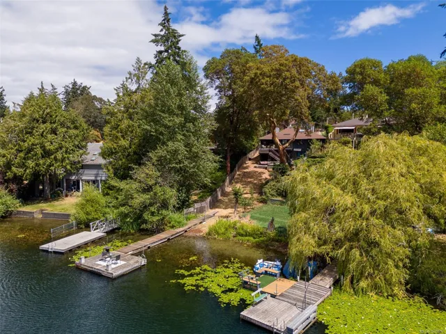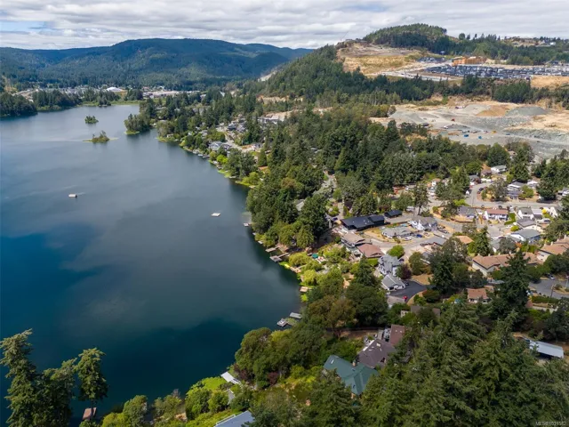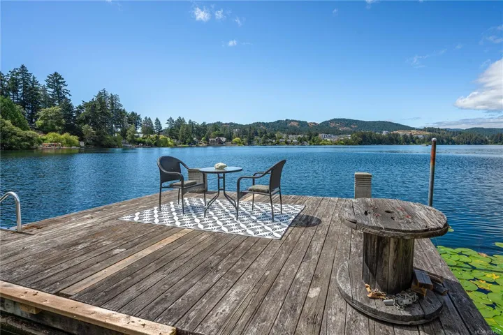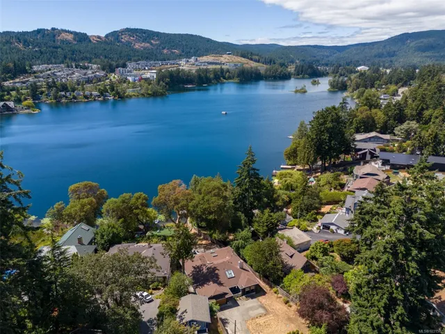 Lakefront living on Langford Lake—this executive home offers waterfront privacy only moments from town centre. Set on nearly 0.5 acres, it combines main and summer home living. Numerous upgrades ensure luxury living. The home provides total privacy w/ main level living & suite below. Walls of glass offer panoramic lake views from the great room & primary retreat. The kitchen boasts updated appliances, shaker cabinets, large island, gas cooktop & ample natural light. Wide plank hardwood floors, board & batten ceiling, skylights, wood fireplace & coved wood ceiling add charm. With 3 beds up, a 4th down, a rec room & separate suite, this home can accommodate a large family or provide income potential. Outside, enjoy patios, a fire pit, gardens, a large shed & a dock. Features include a double car garage, gated driveway, ample parking & covered RV parking. Langford Lake, an electric motor-only lake, ensures serenity. Steps from the YMCA, close to the highway & amenities!