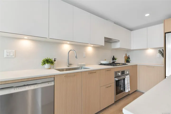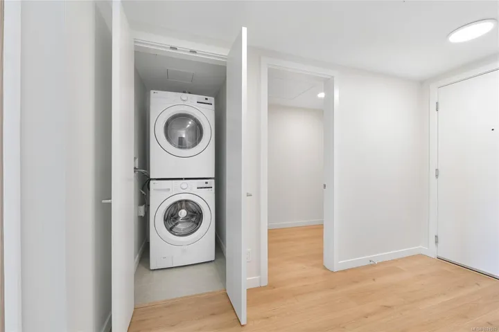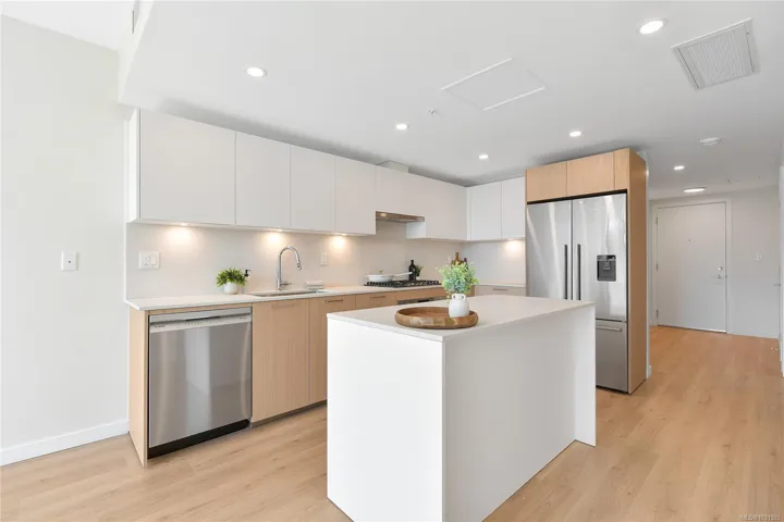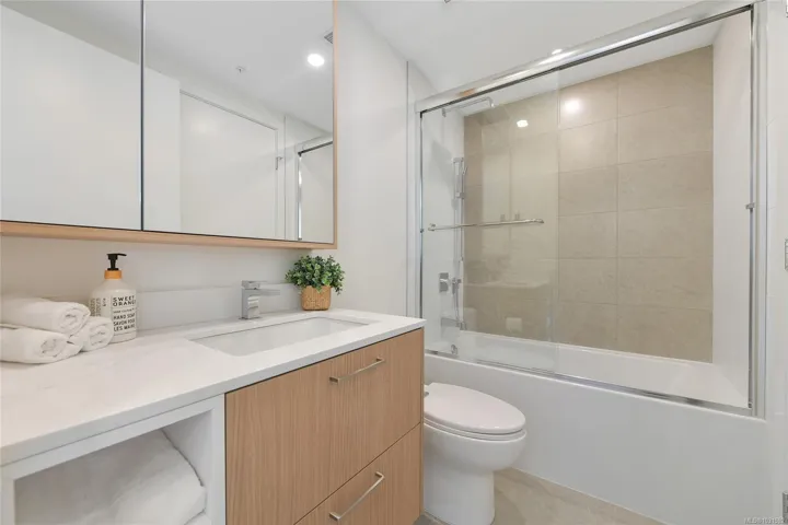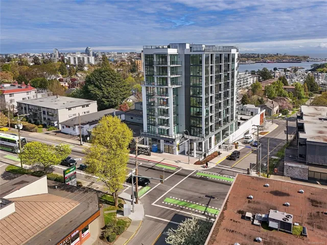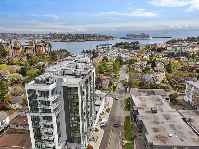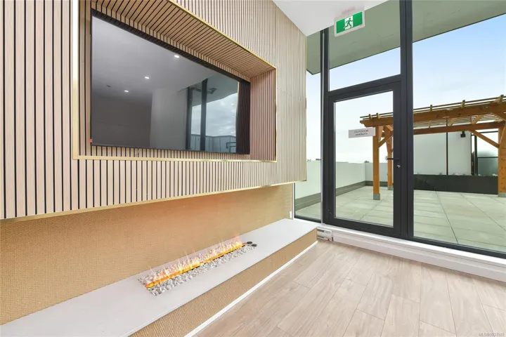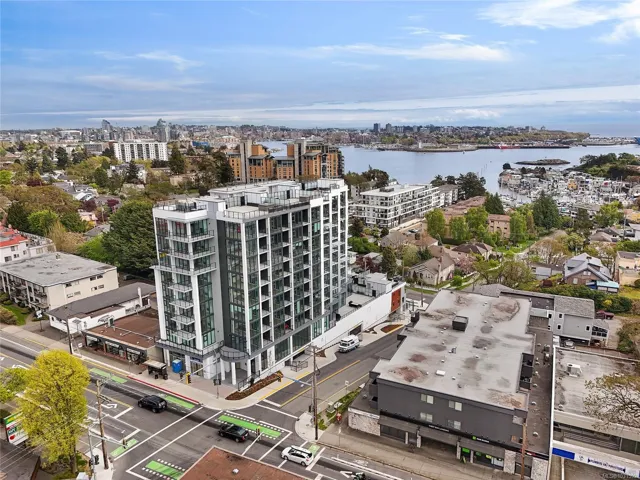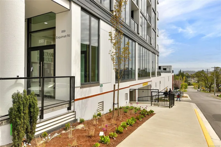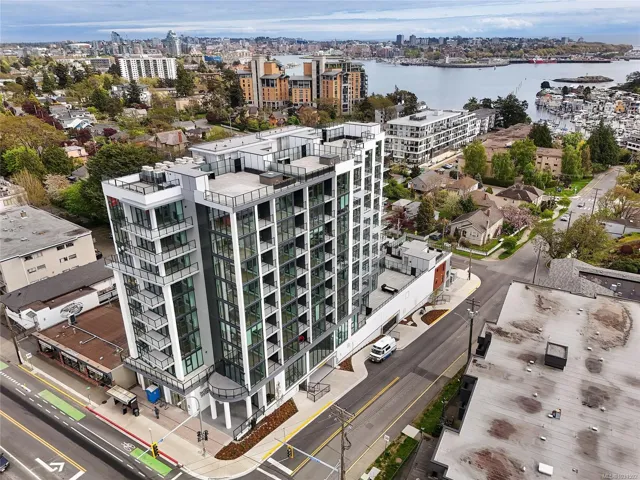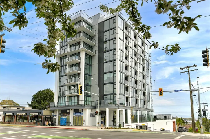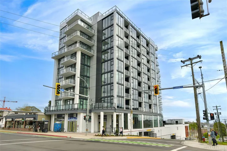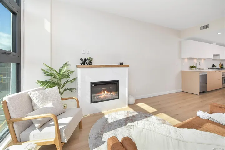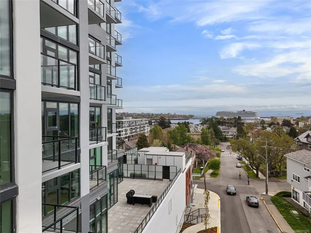 Welcome to Pacific House in the heart of Esquimalt. This brand new 2 bed,1 bath +den pet-friendly home offers bright,well-designed living w/ floor-to-ceiling windows & unobstructed SW ocean views. The open-concept layout creates seamless flow between the kitchen & living area, complete w/ an electric fireplace. The kitchen features Fisher Paykel & Bosch appliances, including a 5-burner gas cooktop, quartz countertops that wrap the backsplash,& ample counter space. Primary bed includes a walk-in closet.The bathroom features heated floors,a rain & handheld shower, & custom medicine cabinet. 2nd bedroom & versatile den offer flexibility for home office or extra storage. In-unit laundry & individually controlled heating & cooling add everyday comfort. Built w/ green standards, this home offers FOB access, secured underground parking, EV stations, storage locker, & rentable common space.Private balcony includes a gas hookup.Steps to Westbay & Songhees Walkway,mins to downtown Vic. Price+GST