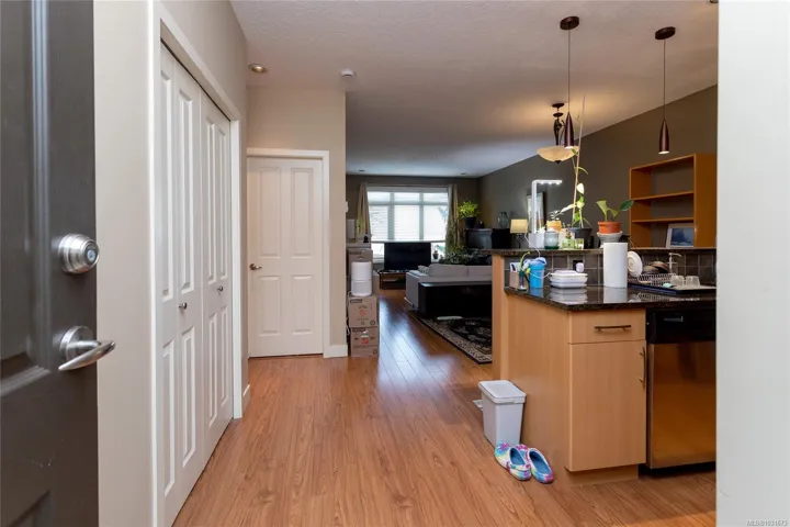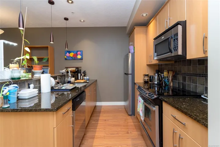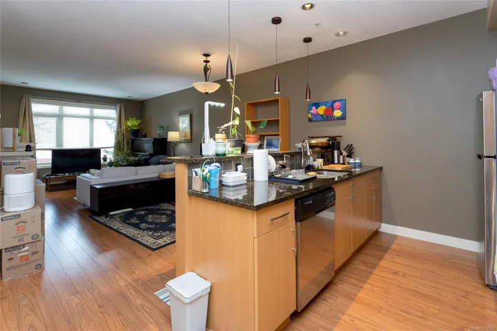 Welcome to La Vie at Millstream Village, where bright, easy living meets a vibrant Langford lifestyle. This light-filled 1 bedroom suite offers an open concept layout with oversized windows, cozy fireplace & seamless flow to a south facing deck at the back of the building. The gourmet kitchen features granite countertops, stainless steel appliances & breakfast bar perfect for everyday living or gathering with friends.The spacious primary bedroom includes access to the balcony for quiet starts to your day or an evening unwind. You’ll love the in suite laundry room for added storage or take larger items down to your secure separate locker. This professionally managed, well-maintained building offers secure underground parking, ample guest parking, bike storage, EV charging & a dog run. Pets, rentals & families are welcome here, all just steps to Millstream Village, cafés, restaurants, groceries, parks, trails & transit with easy access to downtown Victoria & up our beautiful island.
