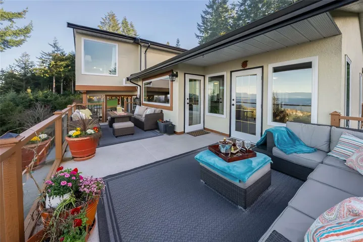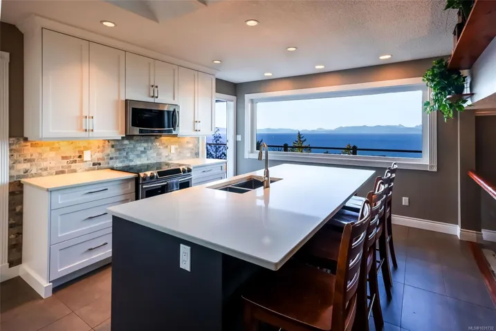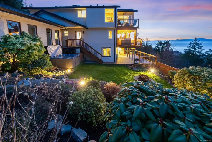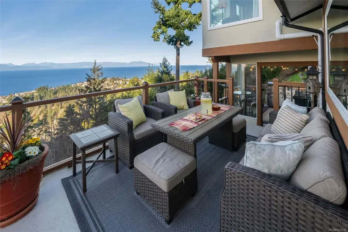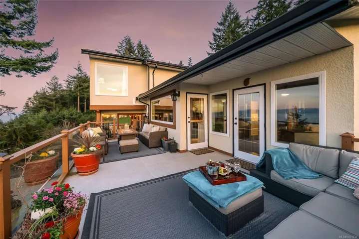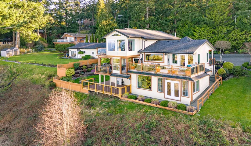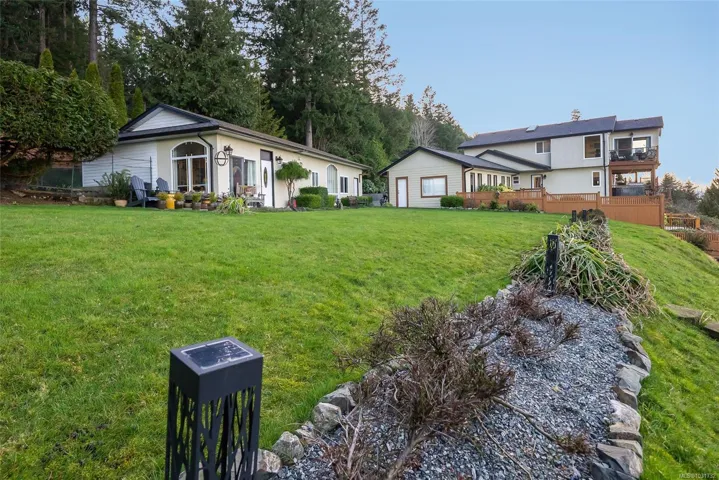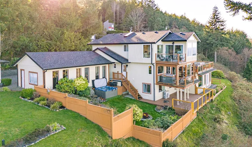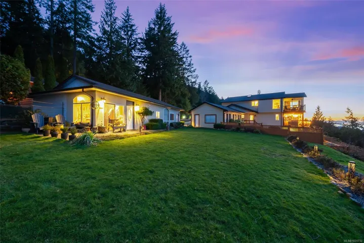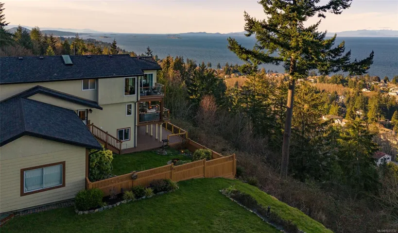 Perched on 1.18 acres with fabulous ocean and mountain views, this exceptional estate offers over 5,500 sq.ft. of living space. The beautifully renovated 4,281 sq.ft main residence is a stunning 3-bedroom upper-level home, with a private studio suite and a separate 2-bedroom suite that can easily be reintegrated into the main living area. Quality finishes throughout include hardwood flooring and expansive windows that frame the spectacular coastal scenery, while the spa-inspired primary suite invites relaxation with its sunken double Jacuzzi tub. The self contained 1,235 sq.ft. guest house with kitchen, full bath, 2 bedrooms, and generous living space is ideal for extended family or guests. Multiple decks provide great views and the private fenced yard and fire pit offer a peaceful retreat. With ample off-street parking, a carport, garage space for all your vehicles and toys, as well as development potential, this is a rare chance to own a remarkable view property in North Nanaimo.