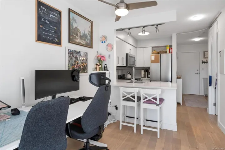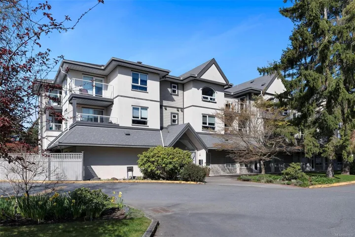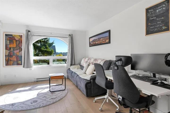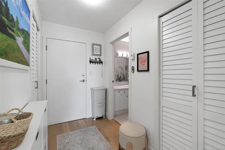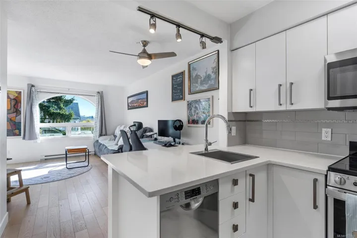 Suite 304 at 2227 James White Boulevard in Sidney, BC is an updated top-floor 1-bedroom offering 558 sq ft with an efficient layout. A spacious foyer leads into the home, where engineered oak hardwood floors run throughout. The kitchen has been beautifully updated with stainless steel appliances, quartz countertops, an eating bar, and opens into a bright, airy living space.