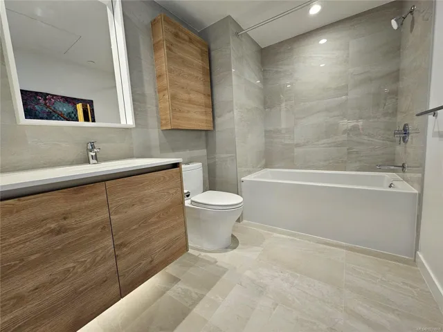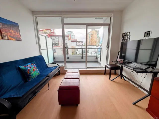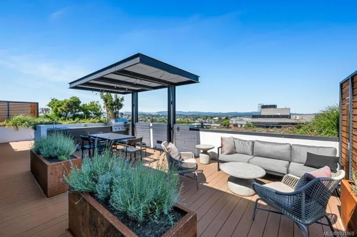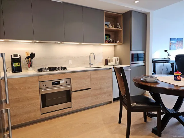 Welcome to Dockside Green in sought-after Vic West, just minutes by foot or bike from Victoria’s Inner Harbour. This beautifully designed 1-bedroom home offers nearly 600 sq.ft. of thoughtfully planned living space within a modern 13-storey concrete building. The sleek kitchen showcases Italian cabinetry, quartz countertops, and a striking single-slab marble backsplash, paired with premium European appliances including refrigerator and dishwasher, oven and gas cooktop. Residents enjoy exclusive access to a rooftop patio featuring three BBQs, a dining area, gas fire pit, and breathtaking views. Additional amenities include a fully equipped fitness centre, social lounge, pet wash station, bike maintenance area and storage, along with a spacious storage locker. Dog-friendly with no size restrictions and rental-friendly, this is an exceptional opportunity to live in one of Victoria’s most desirable communities.