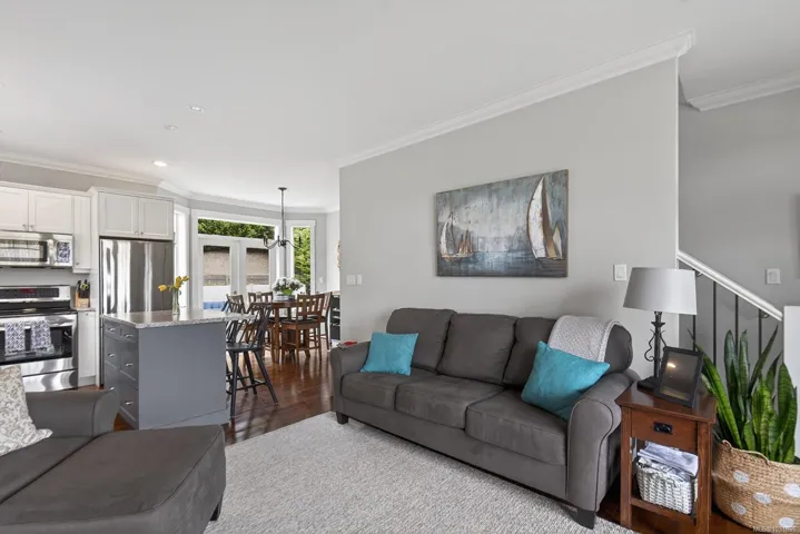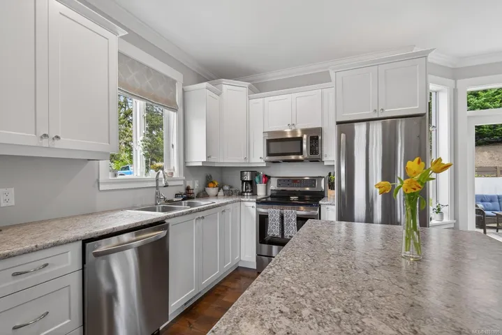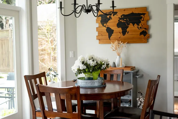 Welcome to this bright and well-maintained Cowichan Bay home, set on a beautiful corner lot in a quiet, family-friendly neighbourhood. The main level features an open-concept kitchen, living, and dining area with hardwood flooring and seamless flow from front to back, opening onto a rear paver patio. A front sundeck and timber frame entry add curb appeal, while a cozy gas fireplace anchors the living room. Upstairs offers two extra-large bedrooms, including a primary with a walk-in closet and a 4-piece ensuite, plus a second full bathroom. A powder room is located on the main level. Additional features include a mudroom/laundry off the garage, a private backyard with a paver patio, concrete garden beds, a storage shed, a large crawl space, a single garage, and HardiePlank siding. Enjoy central heating and air conditioning for efficient year-round comfort, all just minutes from Cowichan Bay village and quick highway access for Victoria commuters.