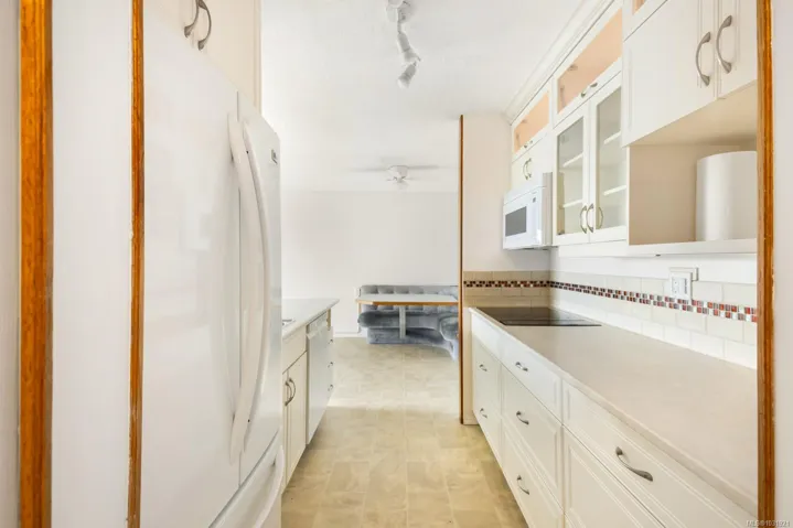 OCEAN VIEW — One of the largest units at Channel View Manor, this bright, freshly painted two bedroom apartment, boasts an updated kitchen w/ample cabinetry and spacious open concept main living/dining area with a custom built-in banquette. Enjoy the views of the Stuart Channel, Gulf Islands and great sunrises from every room! The primary bedroom includes a bonus partial ensuite with shower and sink. The secondary bedroom is well-sized and flooded with natural light. Lots of in-unit storage plus a dedicated storage locker on the ground floor. Channel View Manor is professionally managed and well maintained with beautiful gardens. Common amenities include a meeting/recreation room, exercise room, sauna, guest room and parking for visitors. Low strata fees of $312.26/month. Located in the quaint seaside town of Chemainus, within walking distance to all amenities, steps away from Chemainus Village Square and the Cowichan Valley Trail. Welcome home!