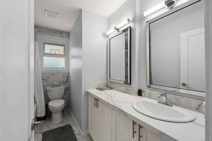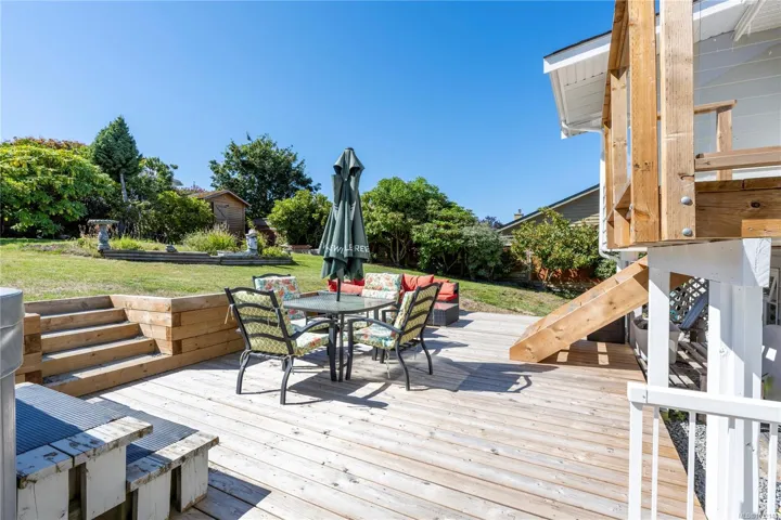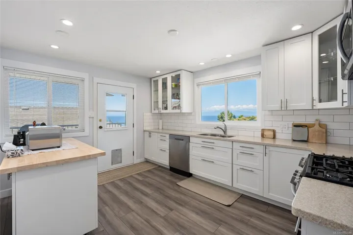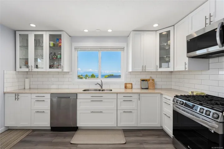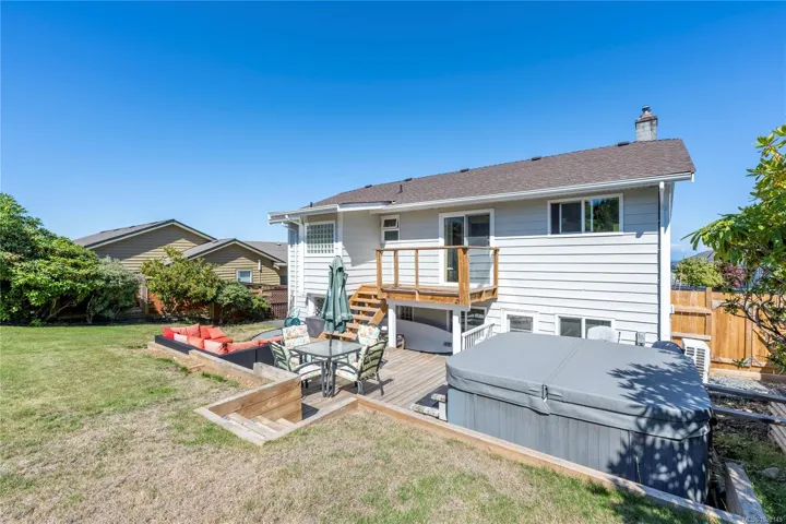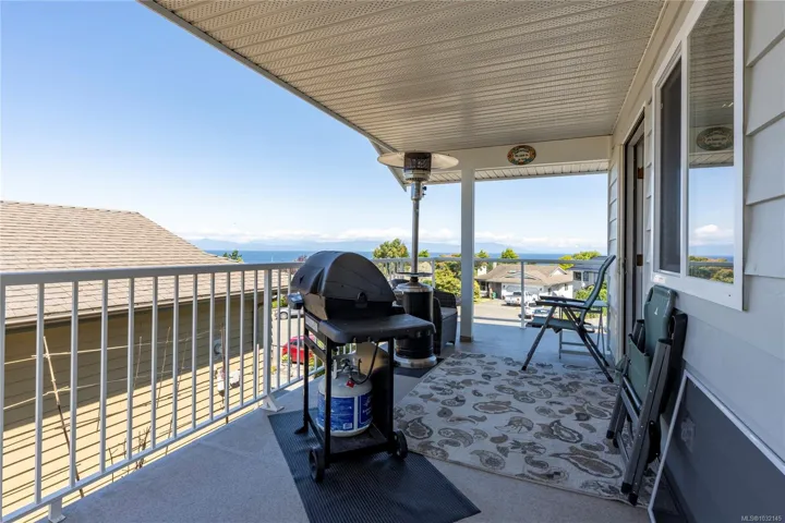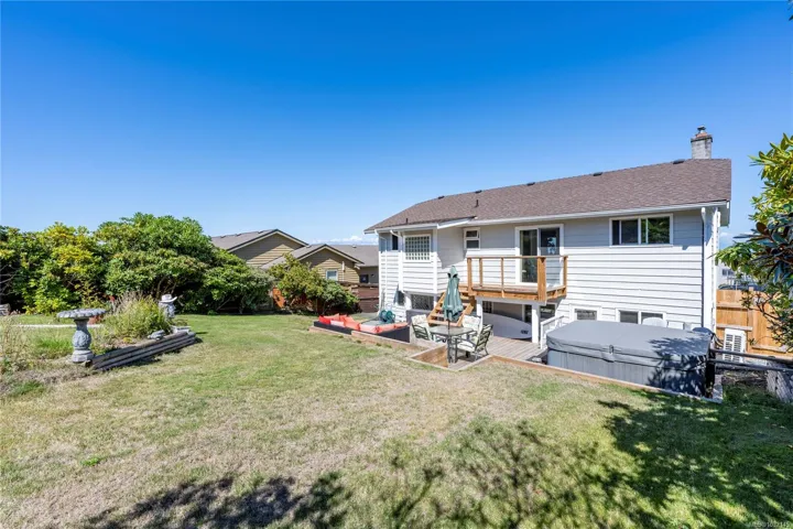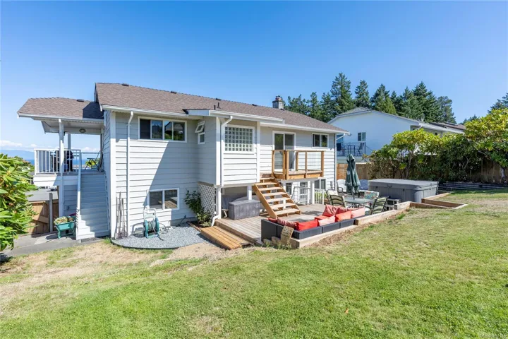 Eagle Point ocean & mountain view family home! This 3 BD 3BA home has plenty of updates, including a bright new kitchen w/ new back splash, soft-close cabinets, stainless gas range & appliances. New flooring, heat pump w/ 3 units provide comfort all year round. Great layout with 3 BD up, large primary w/ updated ensuite, additional laundry, new main BA, 2 more BD w/ access to the front wrap-around view deck & new rear deck/patio w/ hot tub & fenced year yard. Relax and enjoy the ocean views from the large living room w/ gas FP & adjoining dining area. Lower level has been updated, some new flooring, large rec room w/ gas FP & prepped for an in-law suite. Big 5-PC BA & separate laundry is perfect for a suite or extended family. The fenced rear yard is private w/ a variety of trees & space for sun soaked garden beds. Conveniently located across the street from a city park & walking distance to a waterfront access. Close to all north Nanaimo amenities incl. Costco & Woodgrove.