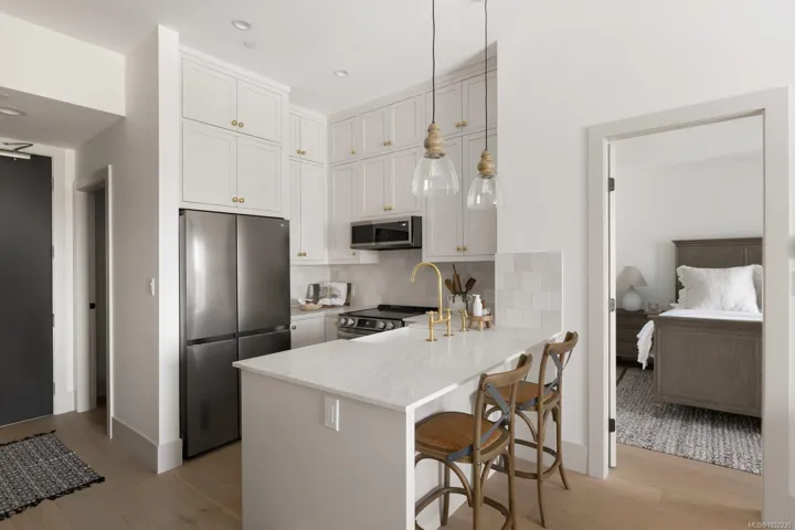 Beautifully updated TOP FLOOR residence in Ponds Landing, ideally located in the village at Bear Mountain Resort.This 2-bedroom plus den home blends modern elegance with timeless design, featuring curated finishes, designer lighting, and a soft neutral palette throughout.The airy 10-ft ceilings and open-concept layout frame a chef-inspired kitchen with a quartz waterfall island, custom wood cabinetry, farmhouse sink, and striking brass details.The inviting living room centers around a custom stone gas fireplace and opens to a covered patio with peaceful courtyard views.The primary suite offers patio access, walk-through closets, and a spa-like ensuite, while the second bedroom has a walk-in closet. The den presents a built-in desk for a flexible study or work from home space.Enjoy year-round climate control with an efficient heat pump. Complete with in-suite laundry, secure underground parking, and storage locker.