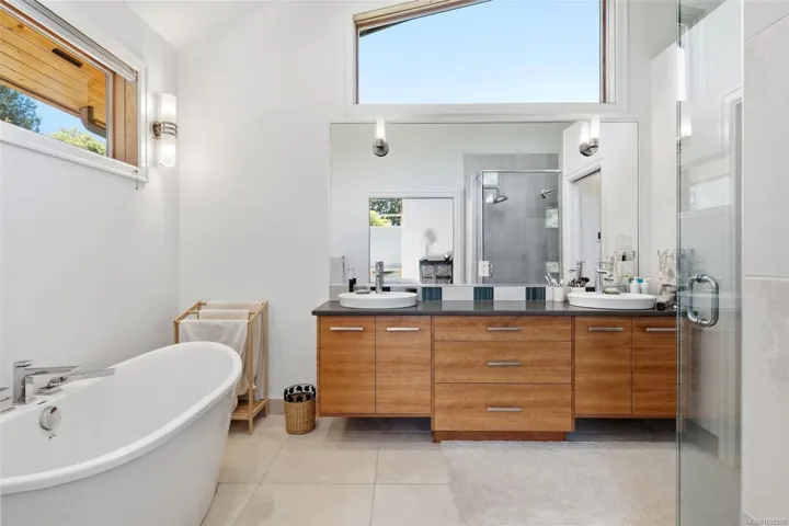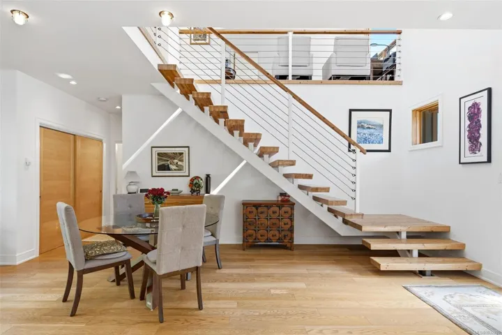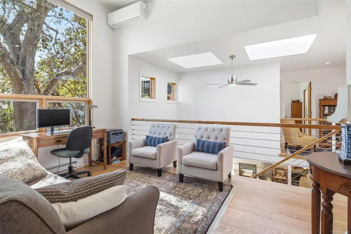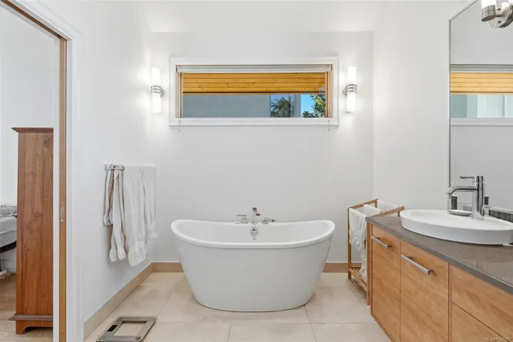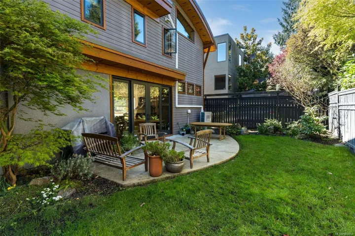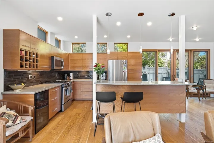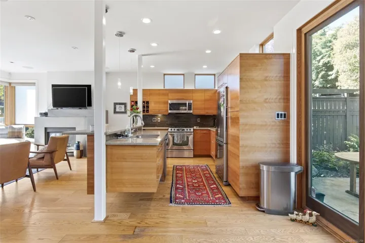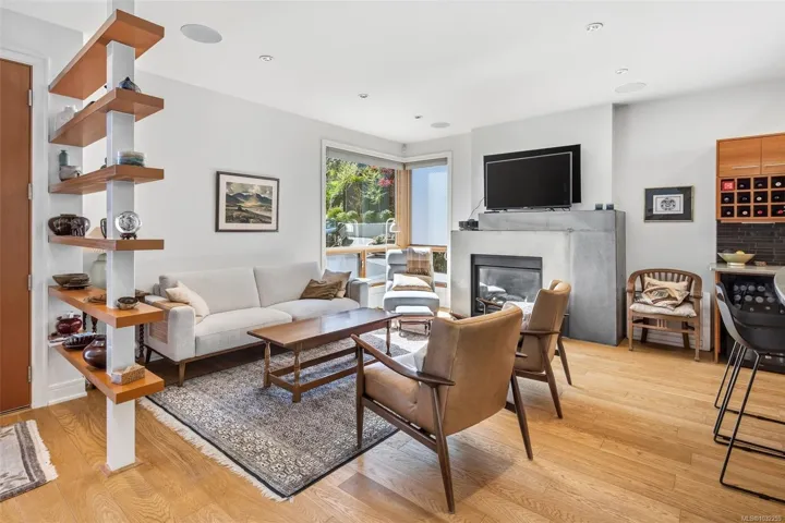 Built by award-winning Abstract Developments, this stunning Fairfield residence blends modern design with high-end craftsmanship. The main floor offers an open-concept layout with a chef-inspired kitchen featuring premium stainless appliances, quartz surfaces, wine fridge, and island seating, alongside bright living and dining spaces anchored by a custom concrete gas fireplace. Upstairs, the vaulted primary suite includes a spa-like ensuite and walk-in closet, plus two additional bedrooms, full bath, and a flexible family room. Quality features include radiant in-floor heating, Pella windows, designer lighting, built-in speakers, and a custom wood staircase, plus a double garage. The west-facing backyard is private and sun-filled—ideal for outdoor living. Bare land strata with no strata fees, only shared municipal utilities and insurance. Located steps from Fairfield Village, Dallas Road, and downtown Victoria.