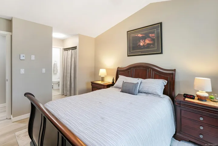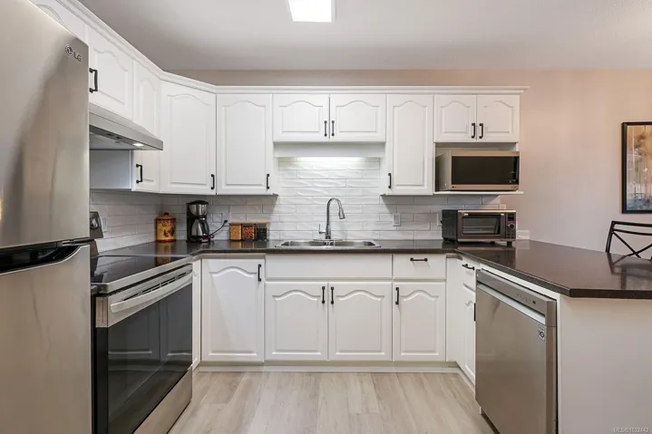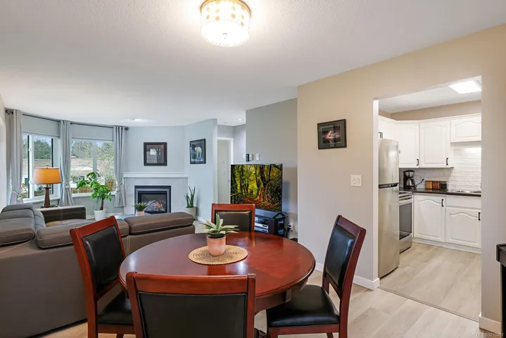 Beautifully updated and well-maintained townhome with a convenient location and fabulous views! Two decks, one with SW exposure and one with NE mountain views add to the spacious floorplan of 1,359 sf, 2 BD/ 2 BA. This lovely 2nd floor townhome boasts a stunning new natural gas high-end fireplace with tile surround, hearth and mantle by Cameron, professionally refinished kitchen cabinets, new tall toilets, a split pump for efficient heating and air conditioning, vinyl plank flooring, triple pane windows, and freshly painted walls. Abundant windows create a light filled happy home including a spacious primary bedroom with vaulted ceilings and beautiful 3 pce ensuite with tiled shower and gorgeous herringbone tiled feature walls. The kitchen offers lots of counter workspace, s/s appliances, white backsplash with a serene coastal, handmade look, and a cozy breakfast nook with a view. A covered carport, lots of storage, close to transit, parks, shops, NIC college and the Hospital.